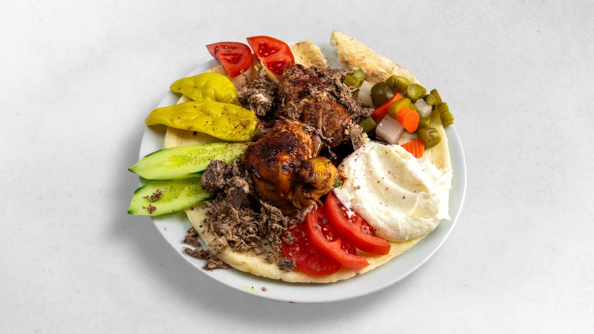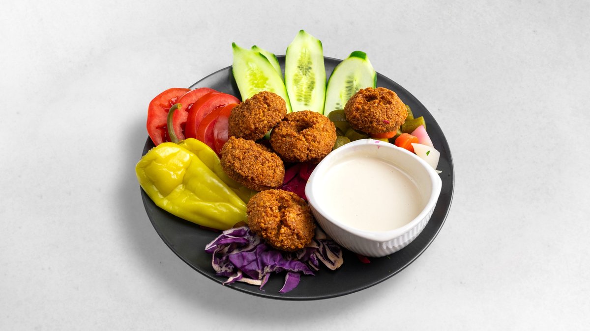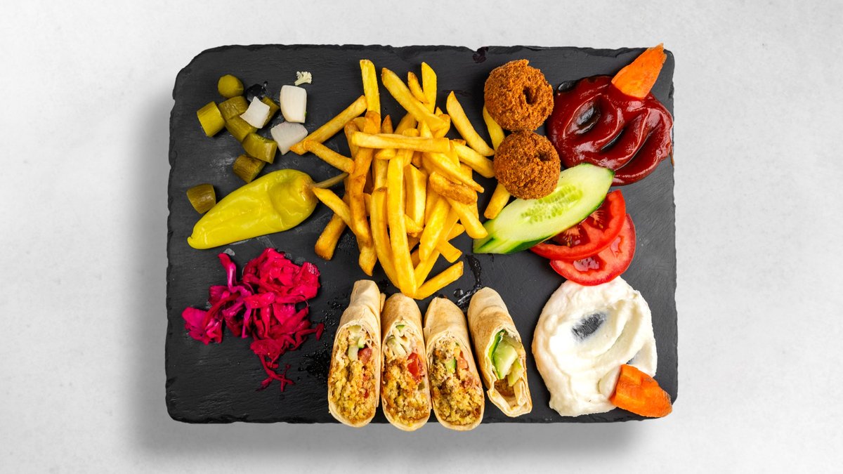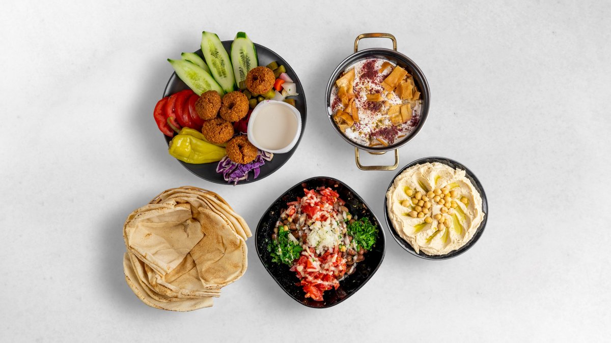 1x Foul, 5x Falafel, 1x Fattet Hummus, 1x Hummus, Fladenbrot, Gemüse, Saure Gurken