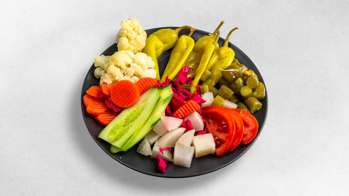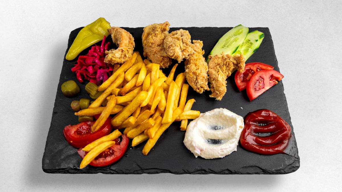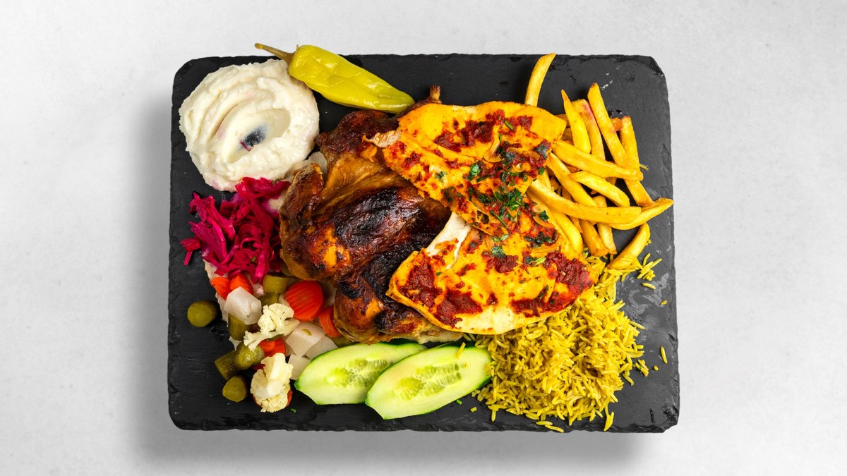 Gegrilltes Hühnerfleisch auf Syrisch, gewürzt, Pommes frites, Gemüse, Saure Gurken, Krimaltuhm