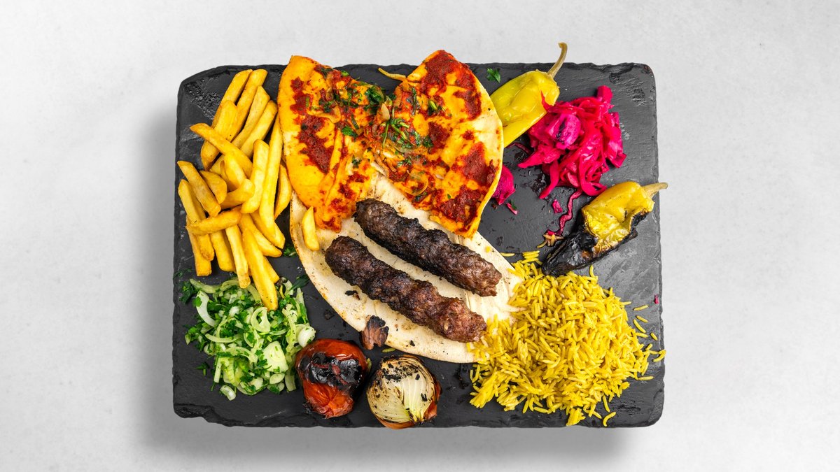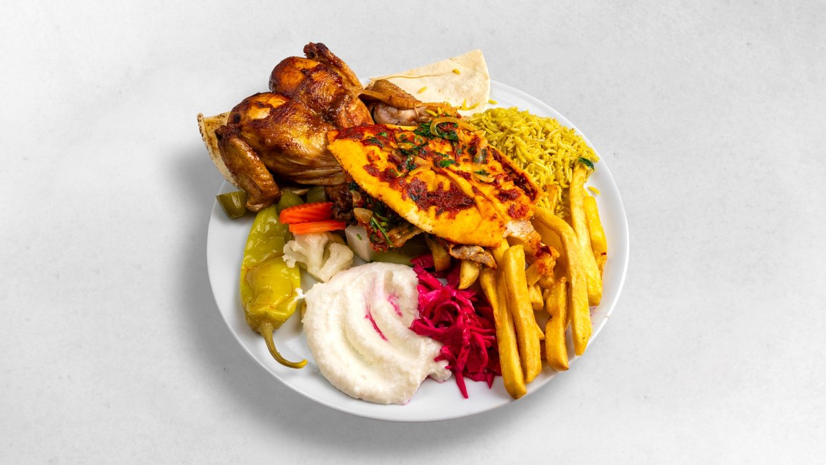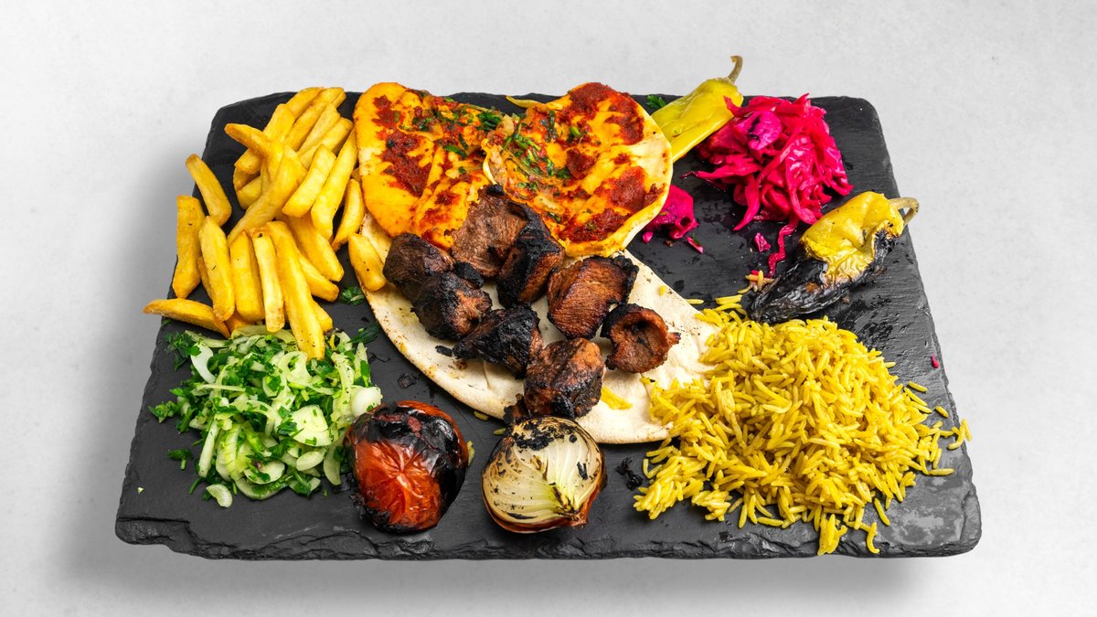 Gemischte Grillplatte mit Lamm & Huhn gegrillt, Gemüse, Fladenbrot, Pommes, Reis