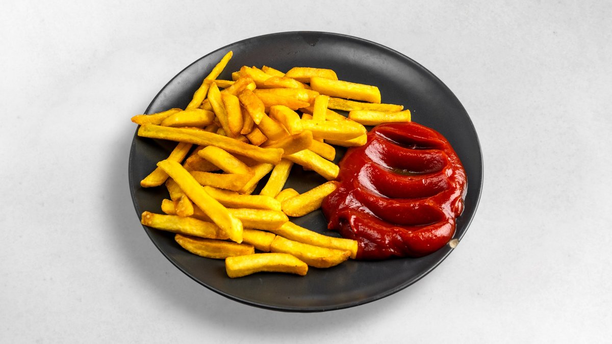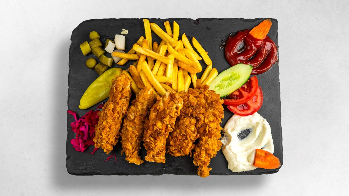 Hühnerbrustfleisch, frittierte Pommes frites, Gemüse, Soße, Salat