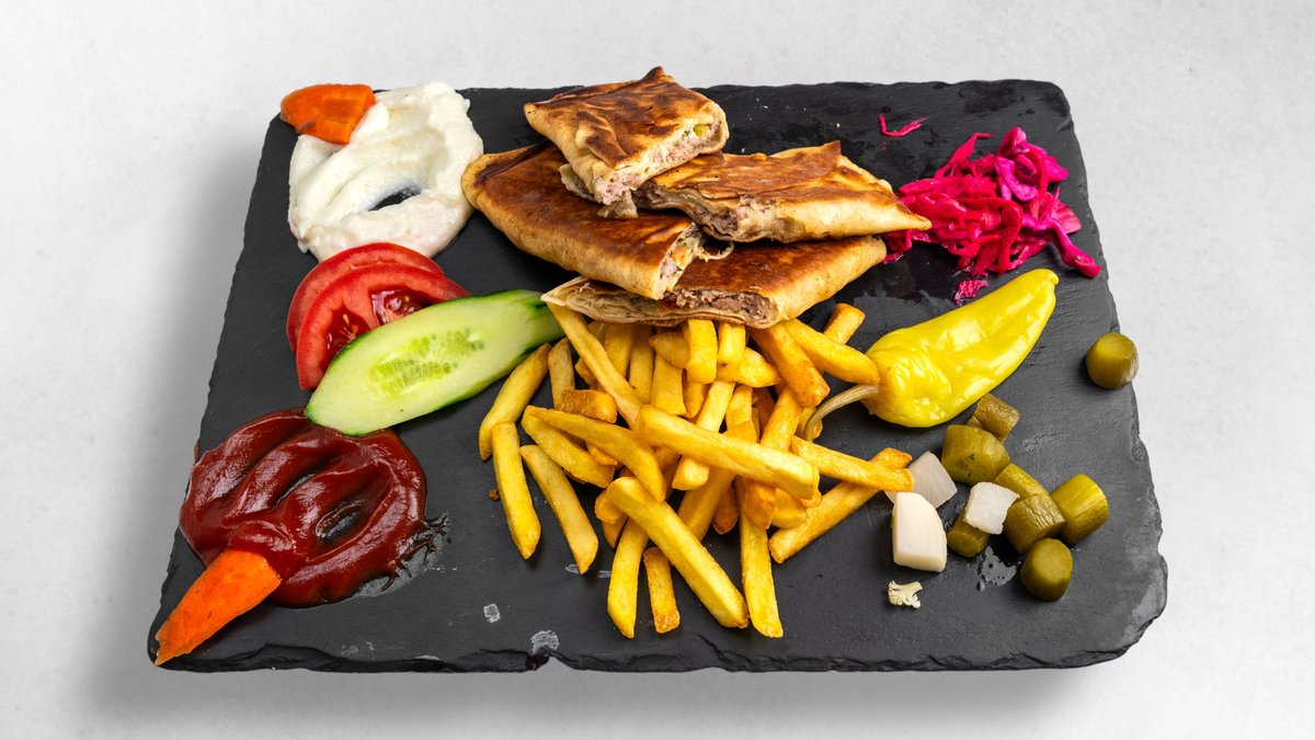 Zwei Sandwich gefüllt mit faschiertem Rindfleisch, Zwiebel, Tomaten, Paprika dazu Pommes, Gemüse, Soße