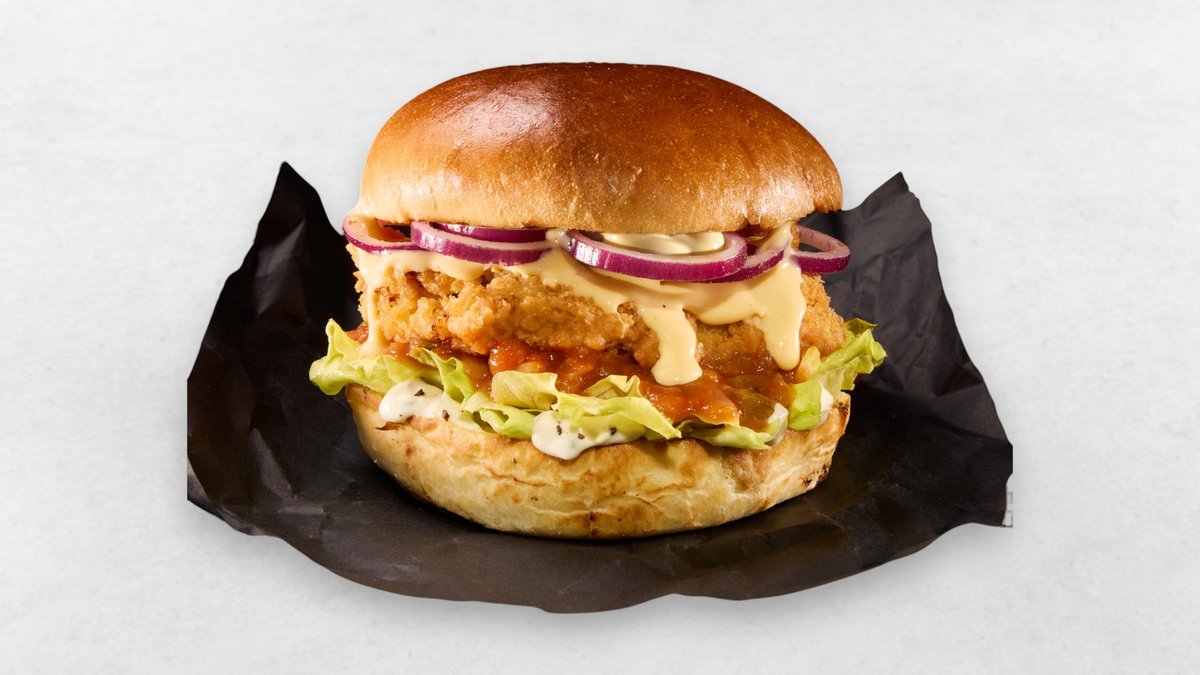 Chicken Crispy Chicken Filet, frische Zwiebelringe, Cheddar Cream, Salat, Relish, Truffle Mayo, Brioche Bun