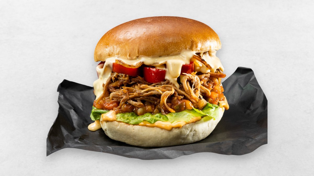 Pulled Pork, Röstzwiebel, Jalapeños, Cheddar Cream, Salat, Relish, Chipotle Mayo, Brioche Bun