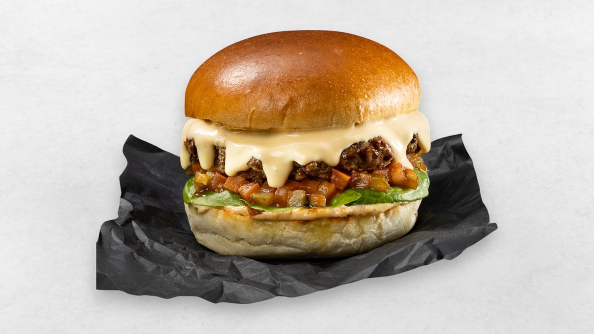 New Meat Patty, Cheddar Cream, Salat, Relish, Mustard Mayo, Brioche Bun