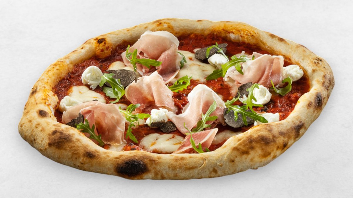 Tomatensoße, Büffel Mozzarella, Prosciutto Crudo, schwarzer Trüffel, Rucola