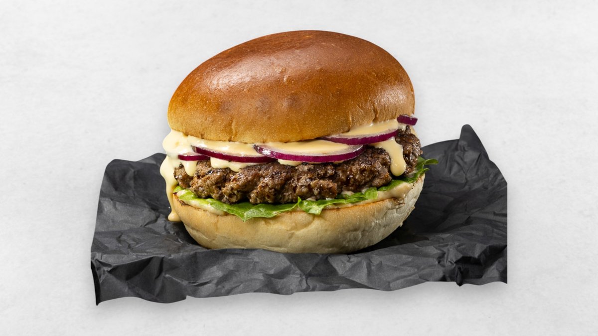New Meat Patty, frische Zwiebelringe, Cheddar Cream, Salat, Mustard Mayo, Brioche Bun
