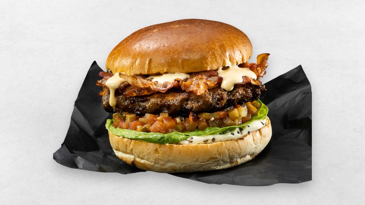 New Meat Patty, Cheddar Cream, Salat, Relish, Truffle Mayo, Brioche Bun