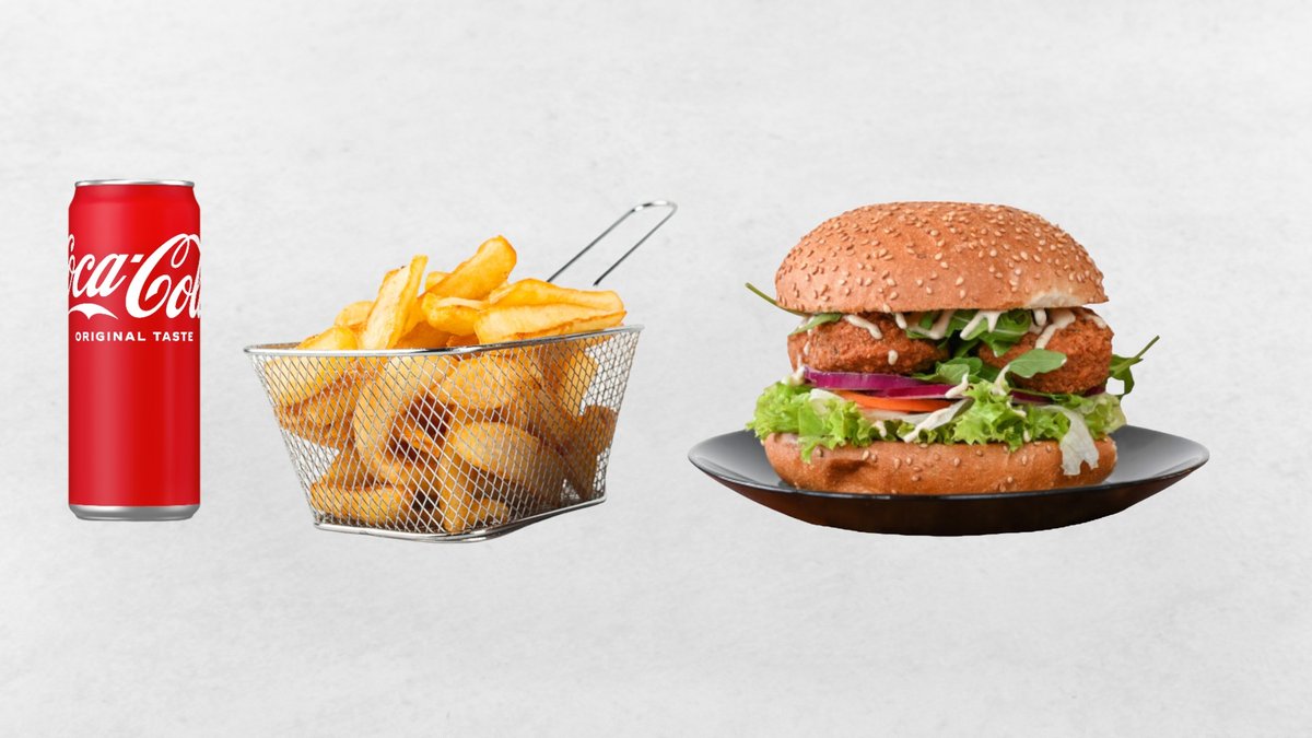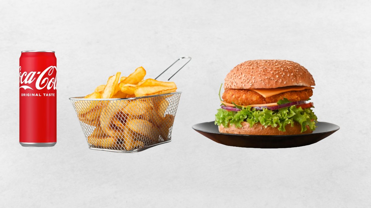Alle Menüs werden mit Burger in einer Größe deiner Wahl, Pommes frites und alkoholfreies Getränk 0,33l serviert