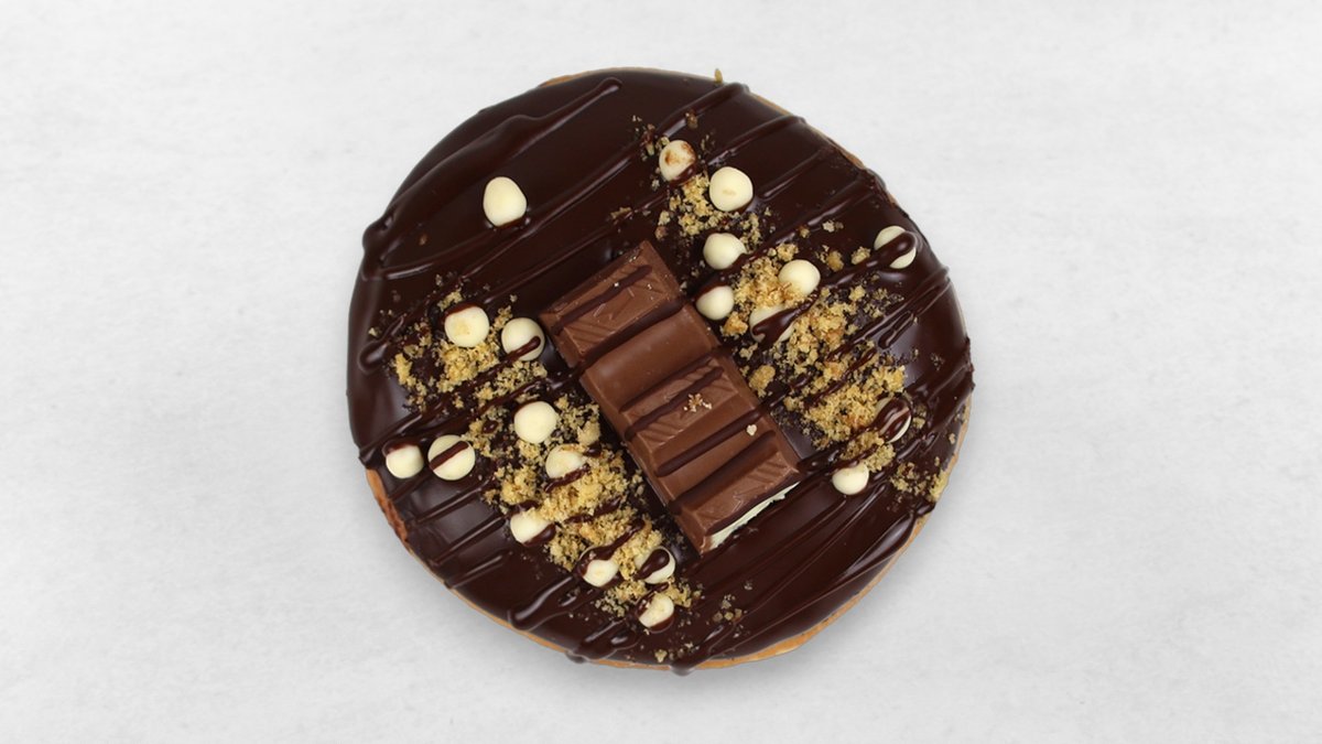 Gefüllt mit Vanillecreme, überzogen mit Schokoglasur, dekoriert mit Kinder Schokolade, weißen Schokoperlen und Kekscrunch