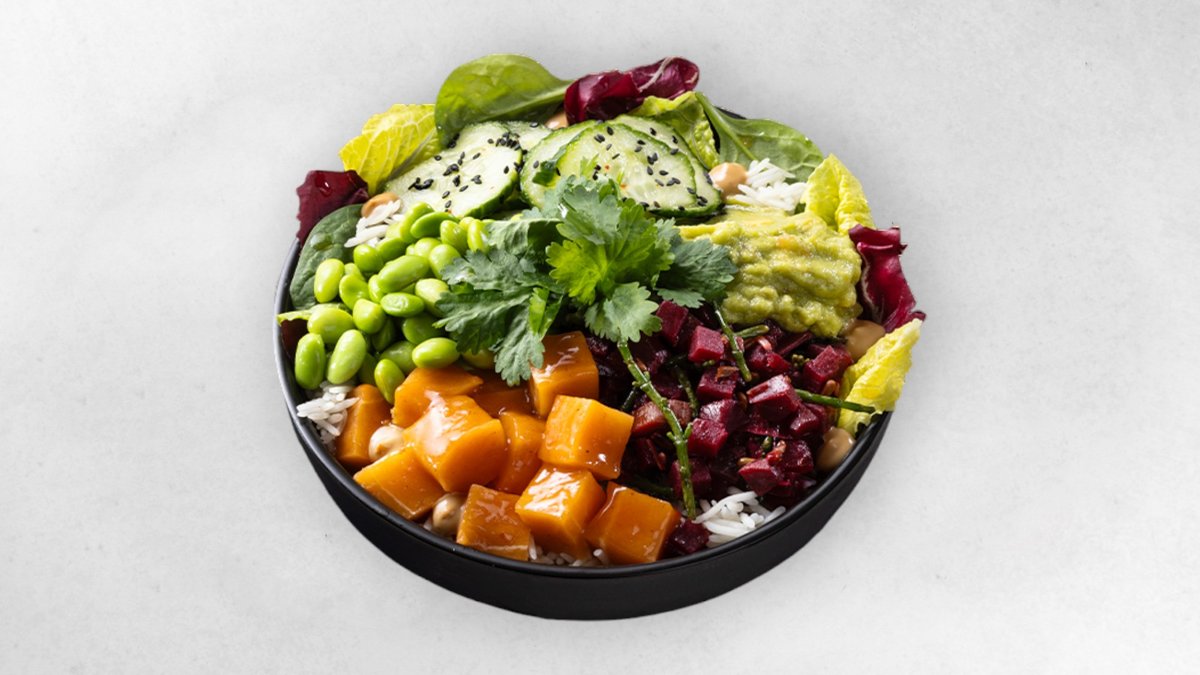 Reis, Salat-Mix, Tomaten, Sproßen, Kerbel, Avocado, Kürbis-Smash , Grillgemüse, Yuzu-Kichererbsen, Kokos-Chips, Asian Plant Based Rind, Teriyaki-Mayonnaise