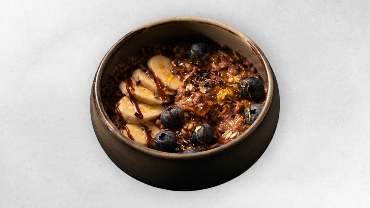 Kakaobruch, Bananen, Heidelbeeren, Schokosoße, Honig