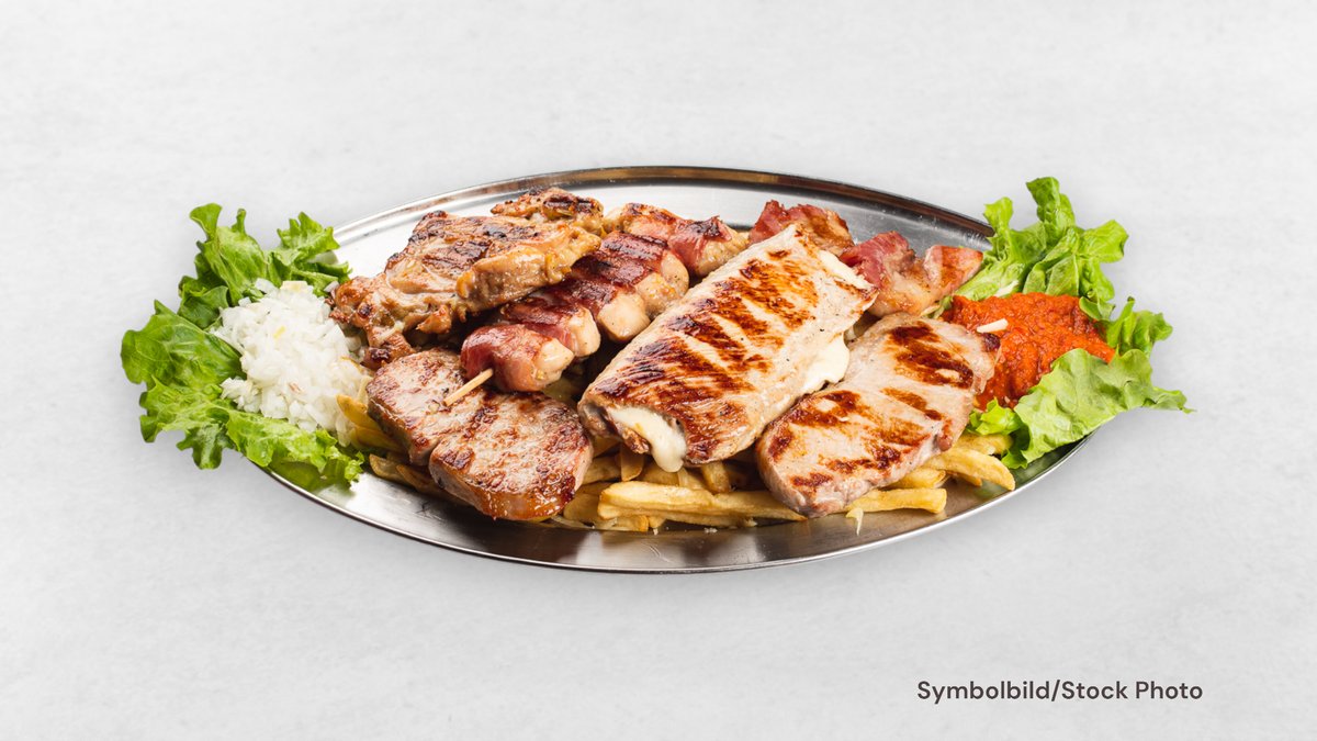 Lammkebab, Lammspleße, Lammkotelett, Hühnerspleß, Zwiebeln, Tomaten, Paprika, Hummus