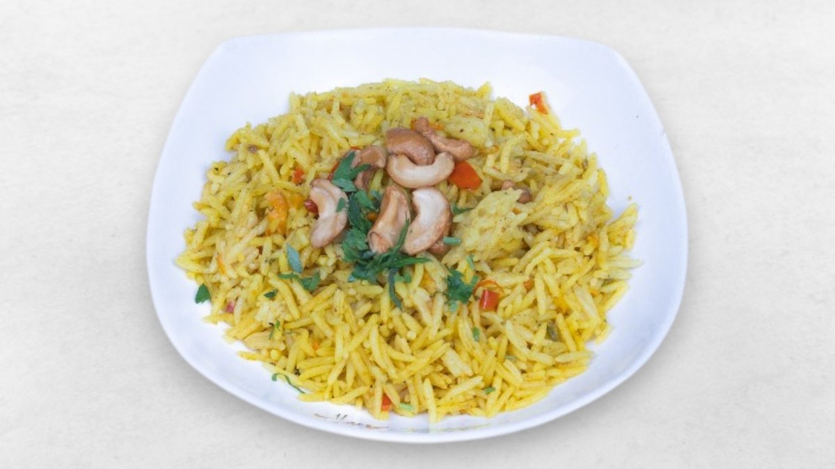 Reis, milde, scharfe Knoblauchcreme, Dakous, Rosinen, Cashew, Salat, Fleischsorte deiner Wahl