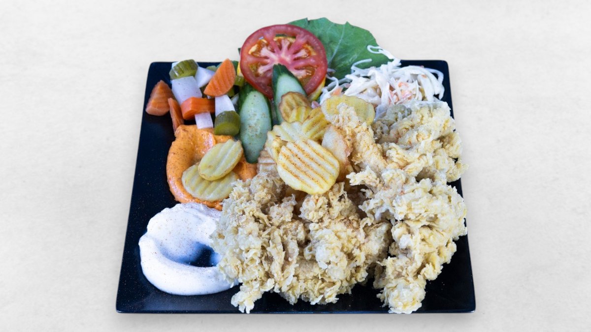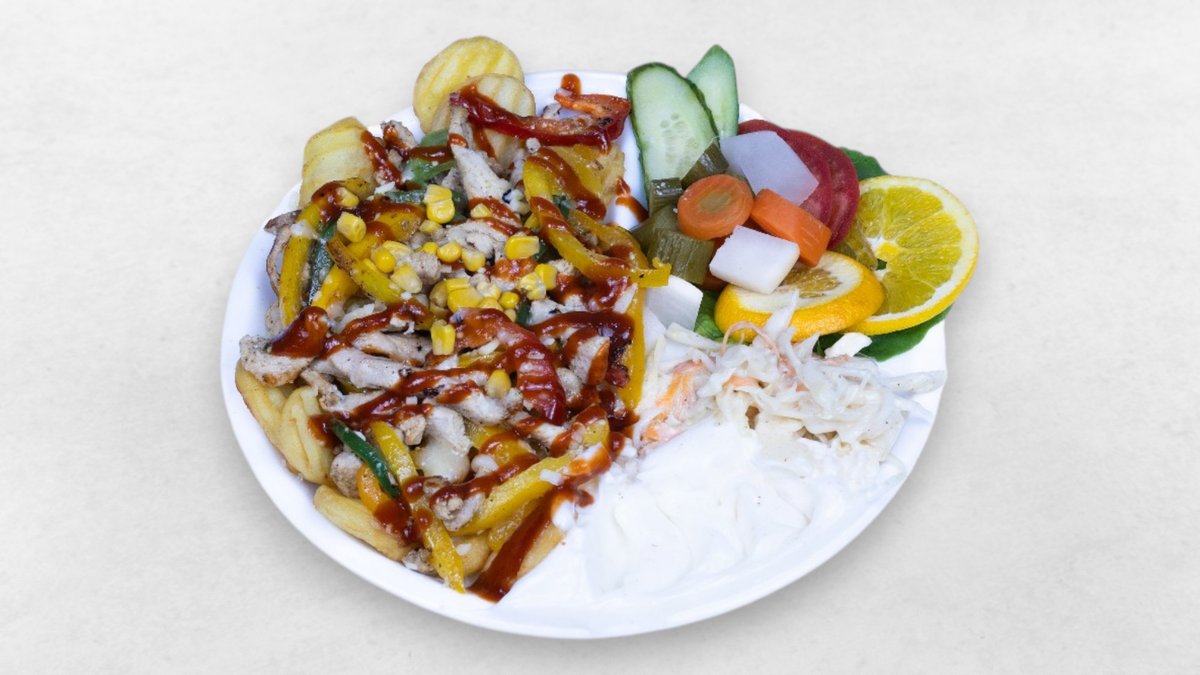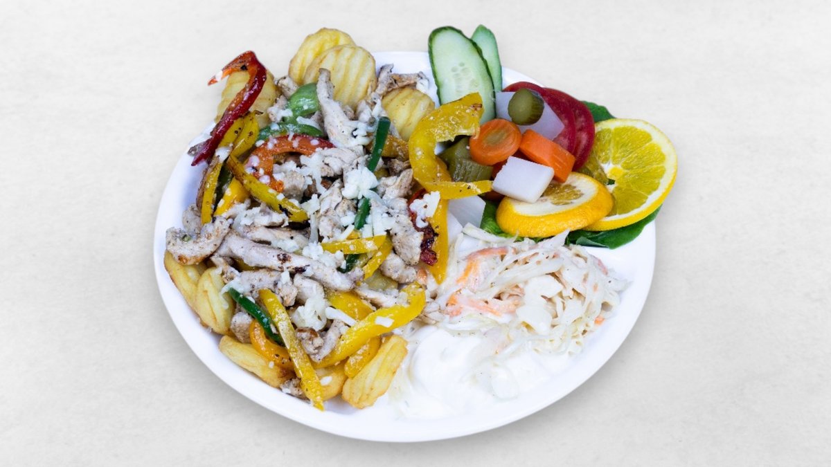 Hühnerstreifen, Knoblauchcreme, Essiggurken, Salat, Pommes