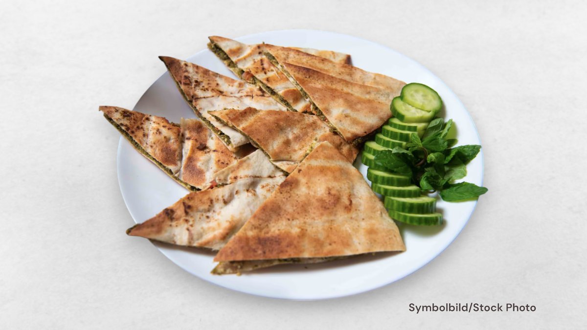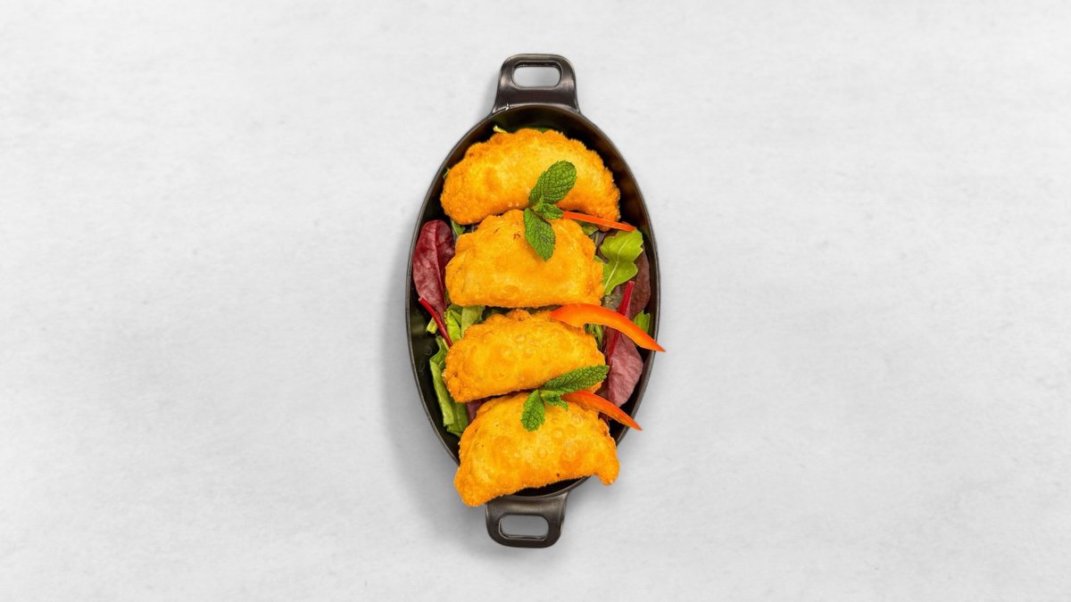 4 Stück knusprig goldbraun gebackene Teigtaschen, würziger Käse