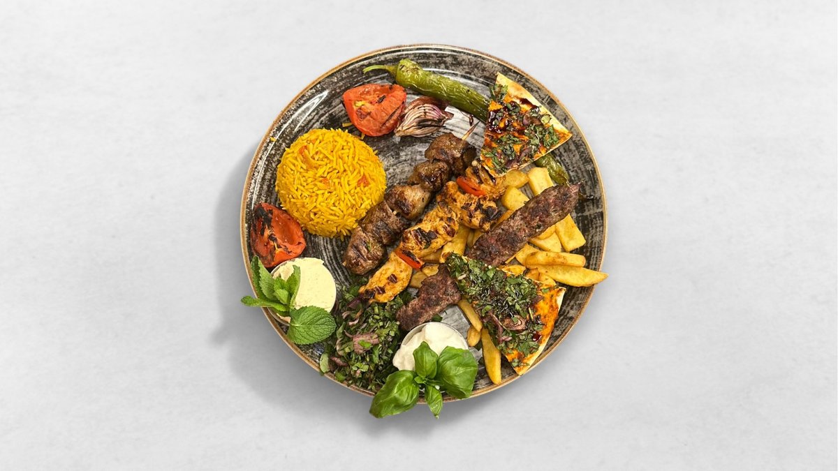 Lavastein, gegrillte Spieße vom Lamm, Rind, Huhn, knusprige Pommes, orientalischer Reis, gegrillte Gemüse