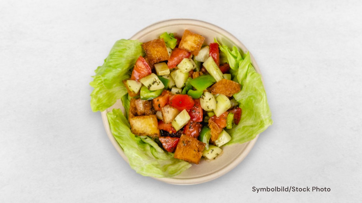 Frischer Salat, Frühlingszwiebeln, Gurken, Tomaten, fruchtige Granatapfeldressing, goldbraune Fladenbrot-Croutons