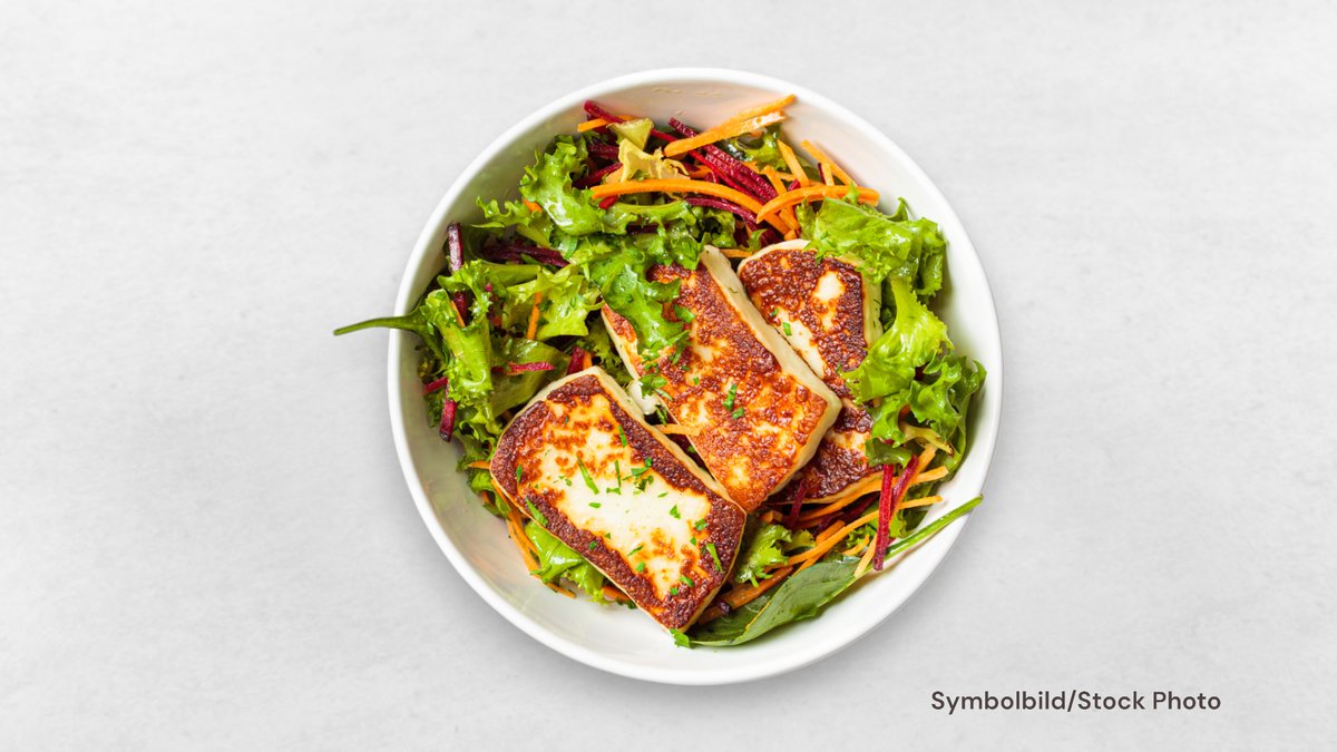 Knusprig gegrillter Halloumi, knackiger Blattsalat, aromatische Granatapfelmarinade