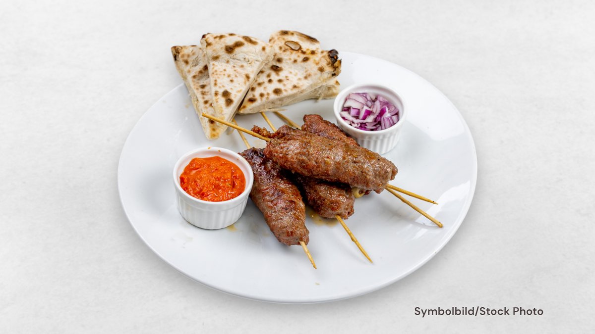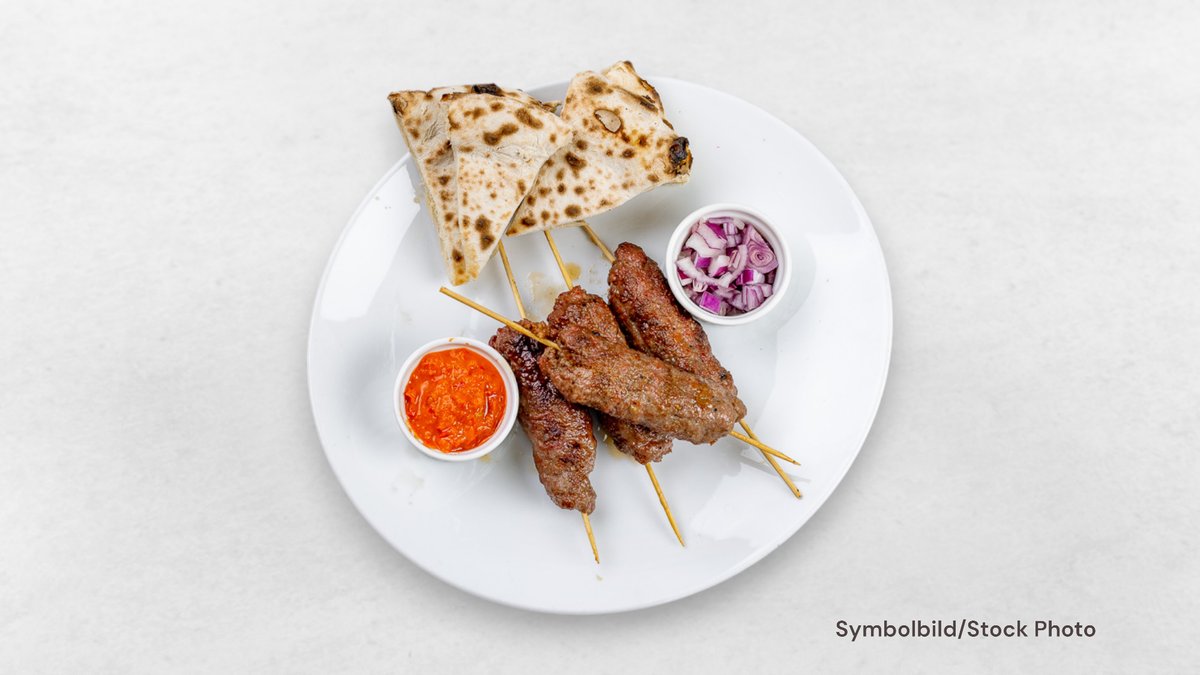 Herzhaft gewürzte Rinderfaschierte-Spieße, Lavasteingrill, Knoblauchsoße, Beilage deiner Wahl