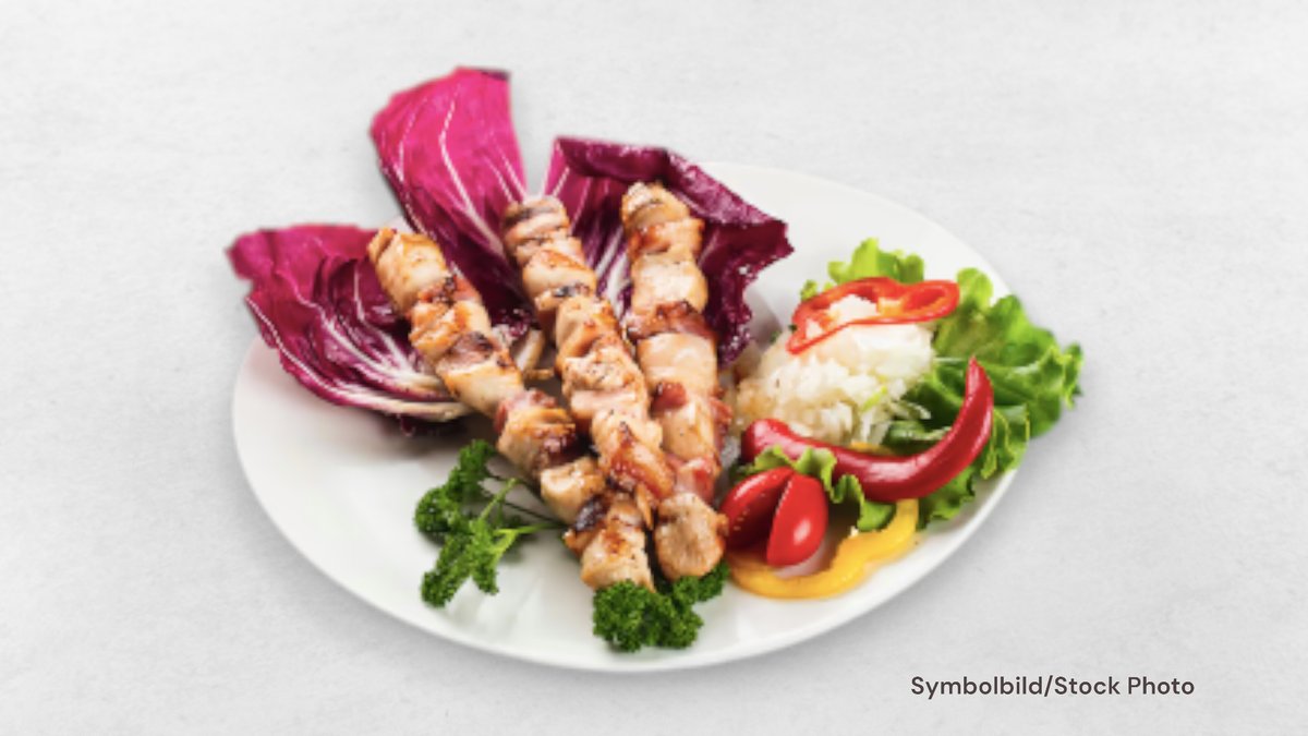 Zarte Hühnerspieße, Lavasteingrill, aromatische Knoblauchsoße, Beilage deiner Wahl