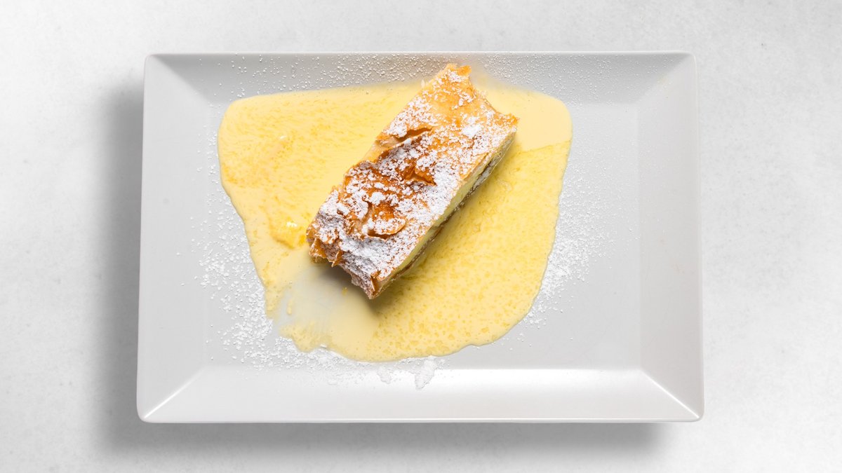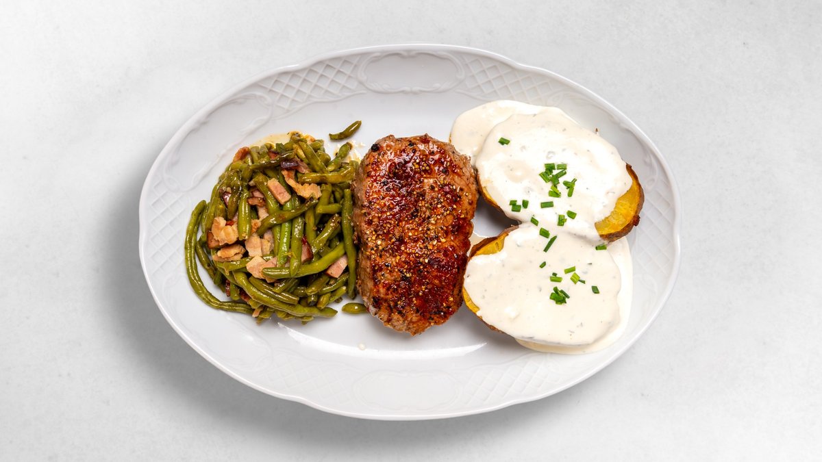 mit Speckfisolen, Ofenerdäpfeln und Rahm