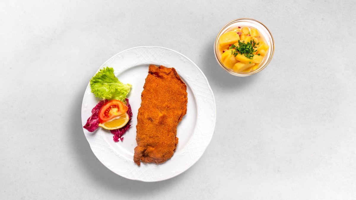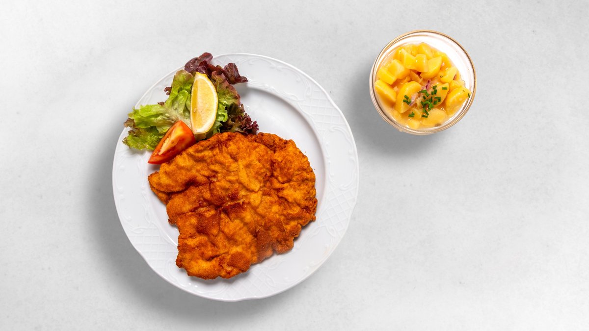 mit Serviettenknödel, Fächergurkerl, Würstl und Spiegelei