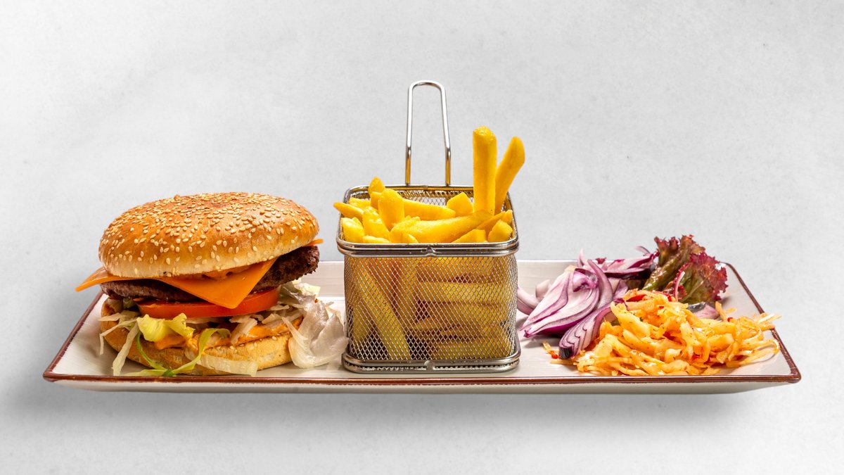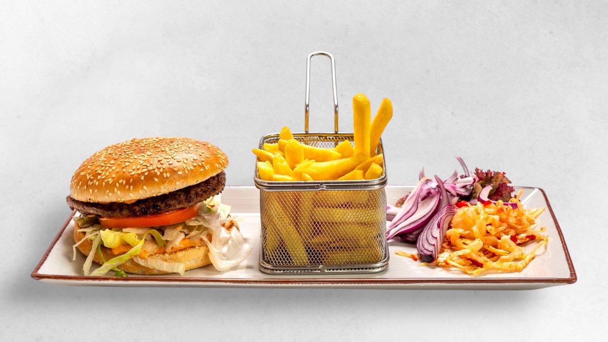 Gemüsepatty mit Paprika, Zwiebeln, Tomaten, Salat und Pommes