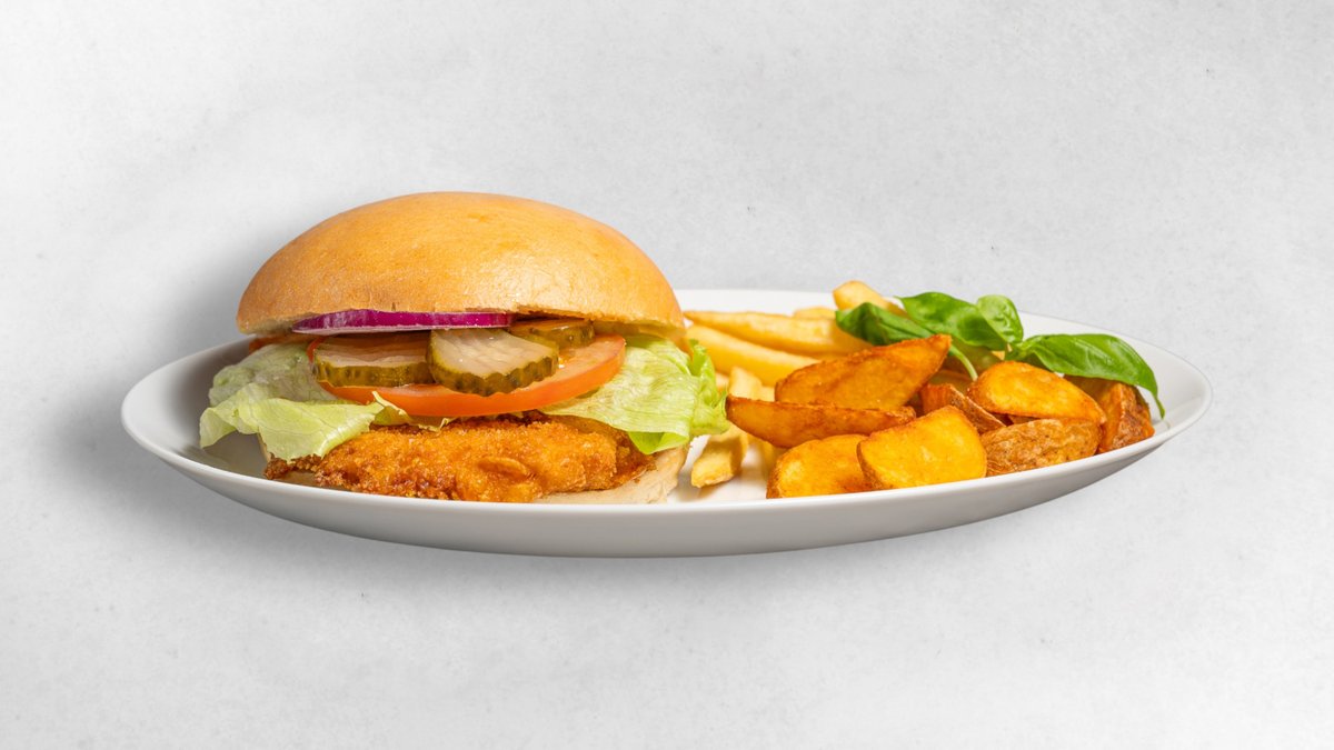 Panierte Hühnerfilet, grüner Salat, Tomate, Zwiebeln, Cheddar Käse