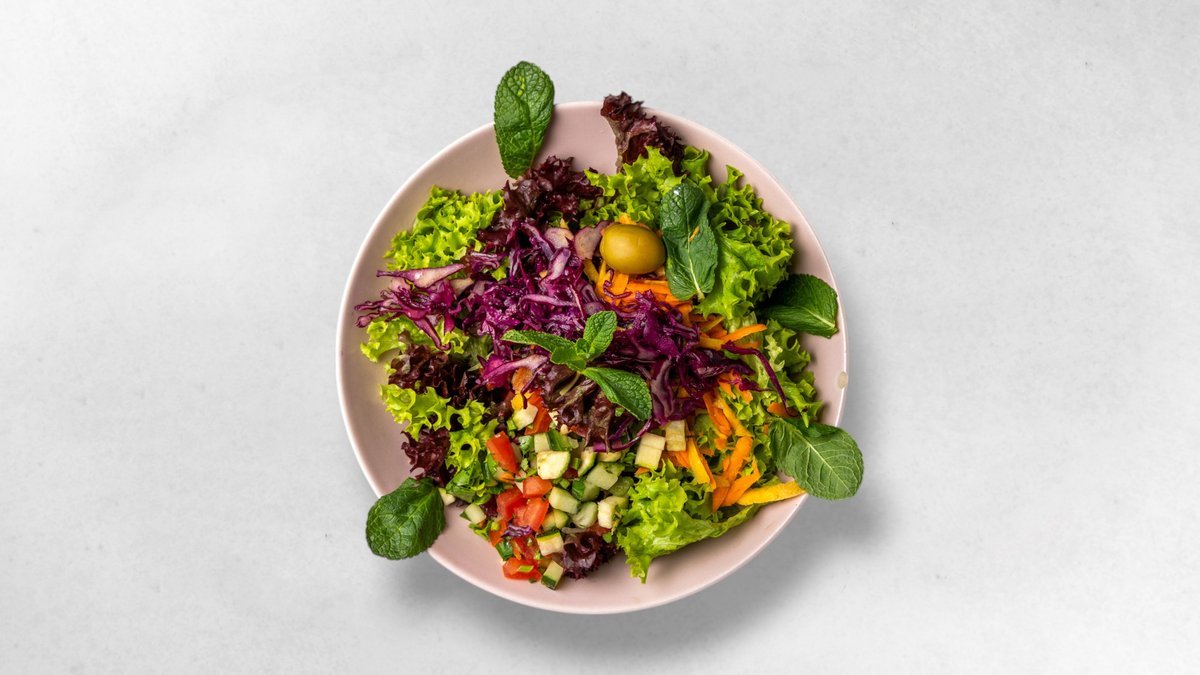 2 Produkten deiner Wahl, Hummus, Rotkraut, gemischter Salat und frische Gemüse