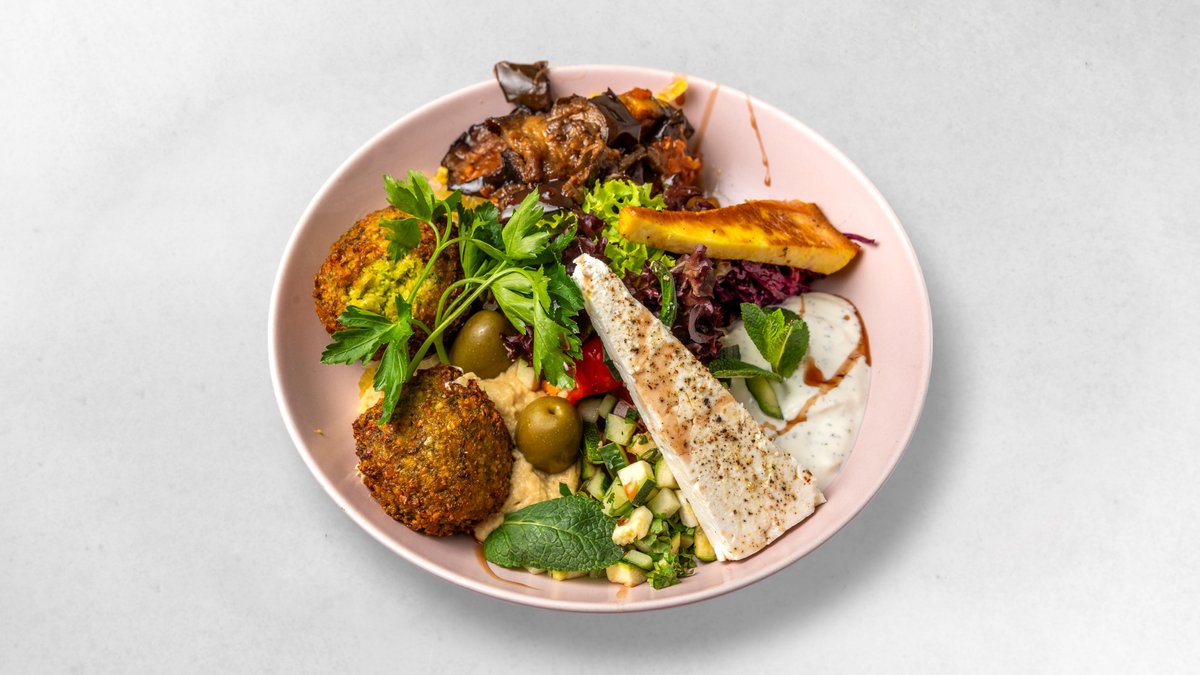 Falafel, Hühnerfilet, Halumi, Hummus, Rotkraut, gemischter Salat, frische Gemüse