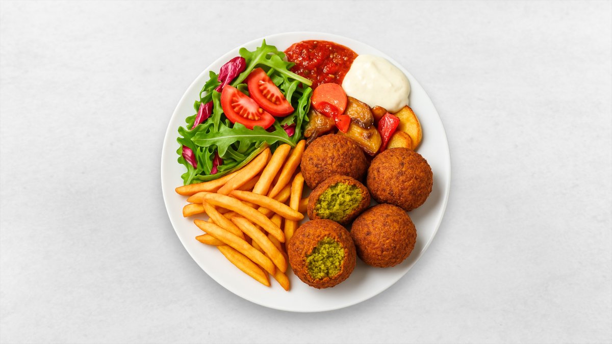 Mit Pommes Frites. Sauce ist nicht inkludiert. Bitte beim bestellen auswählen.
