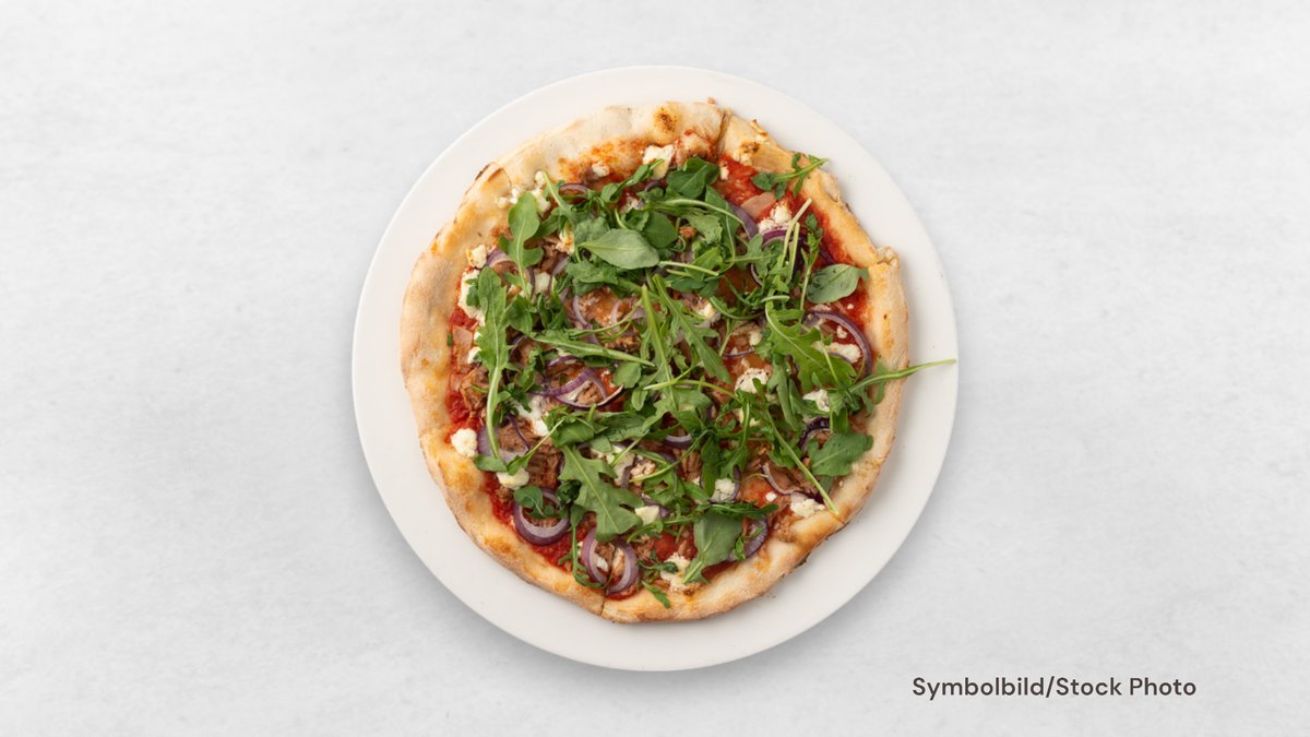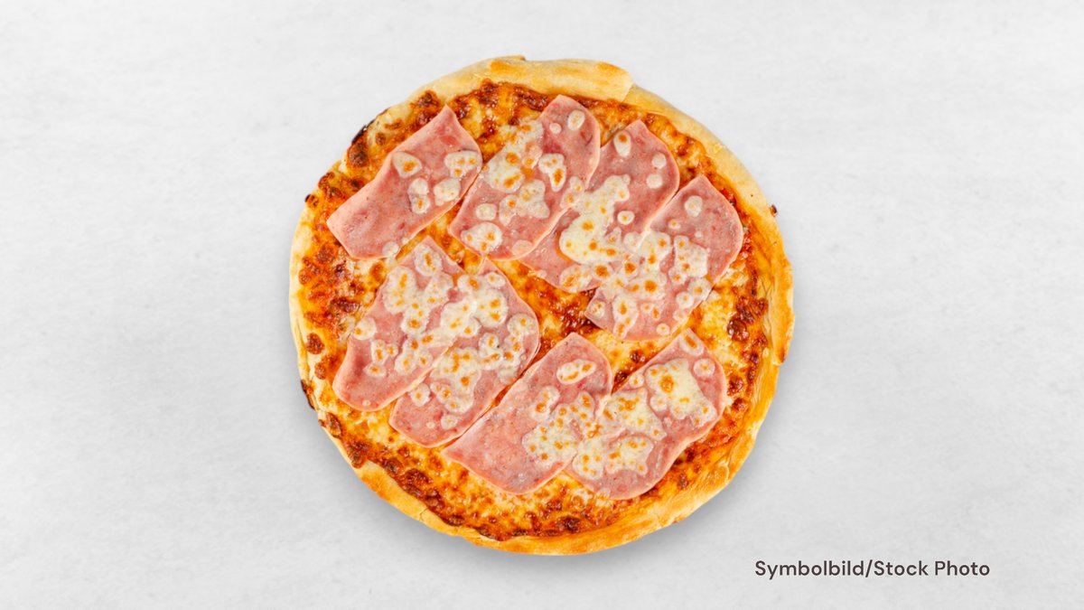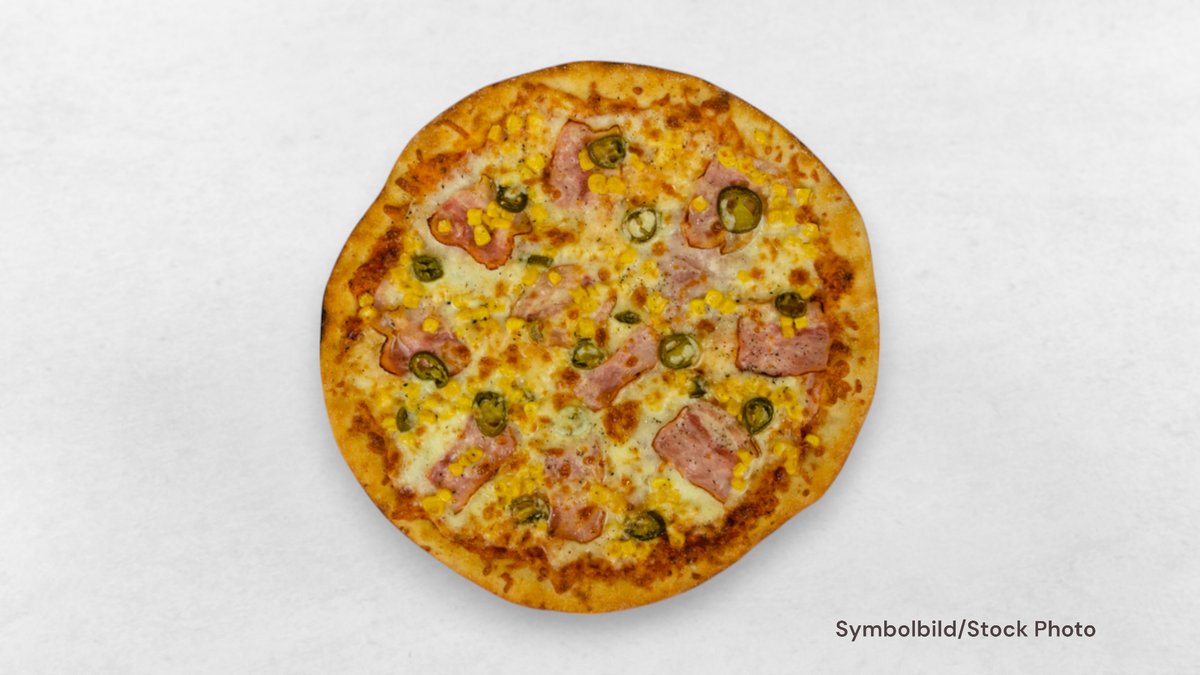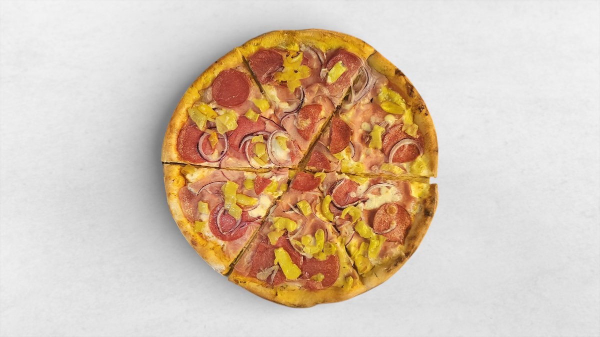 Tomatensauce, Mozzarella, Schinken, Salami, Pfefferoni und Zwiebeln