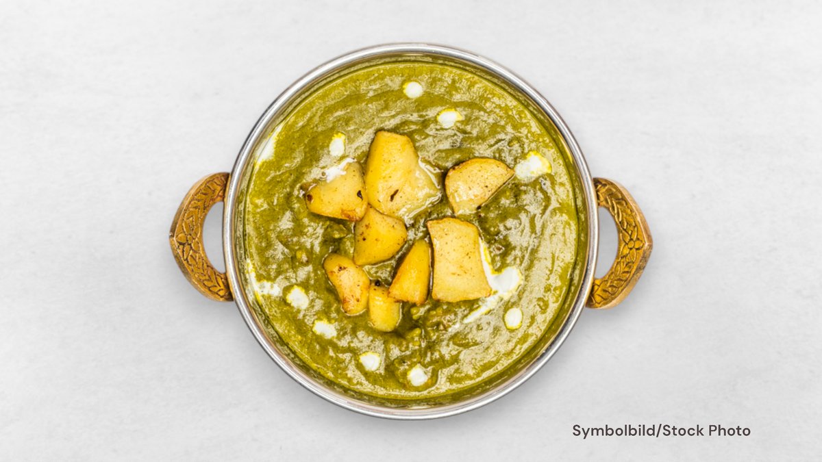 Süß-Saure-Spinatpflaumensoße, Lammfleisch, Kräutern, Safranreis, Salat
