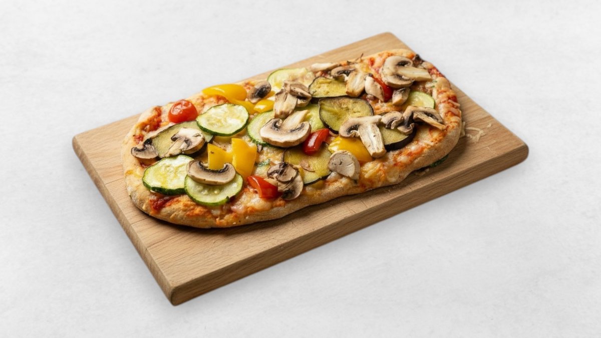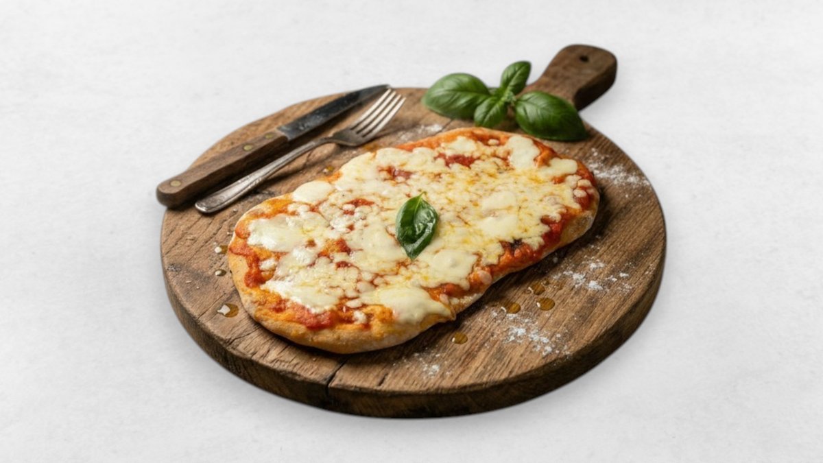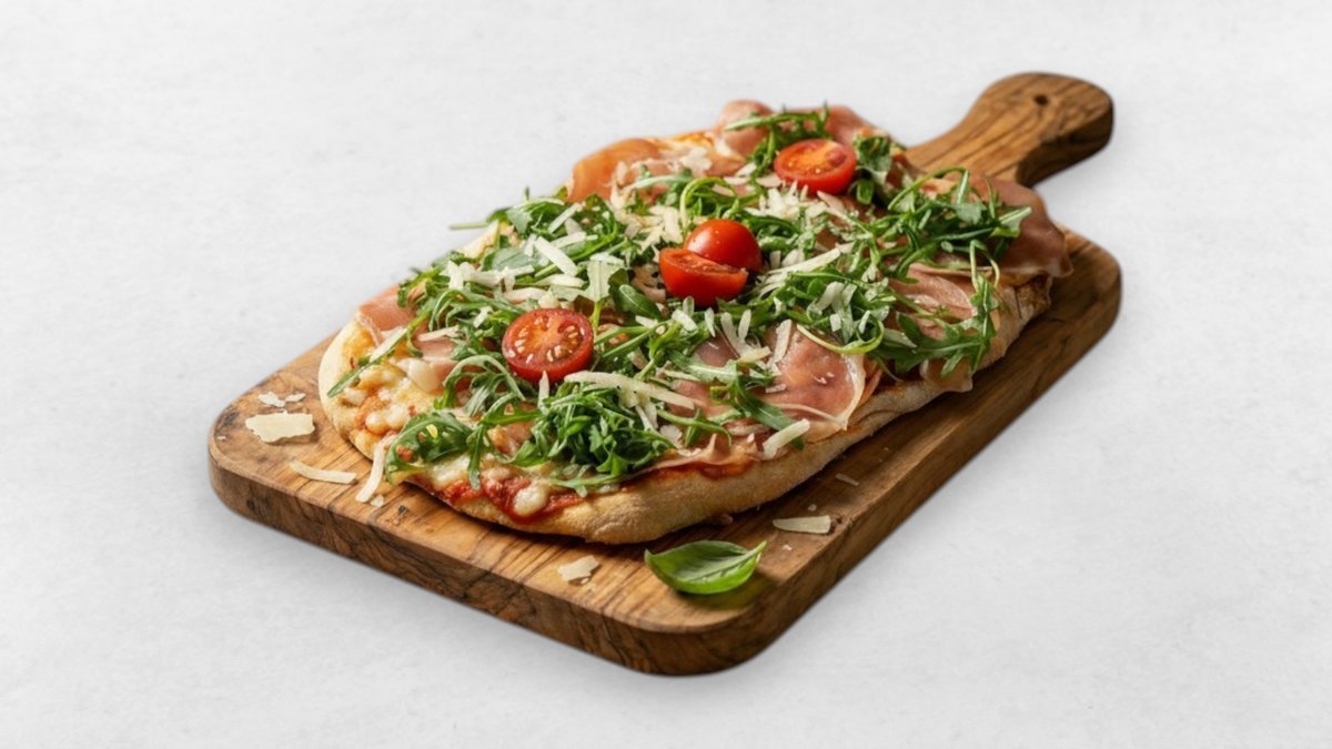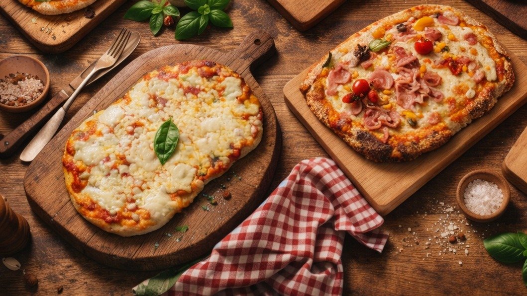 Alle Gerichte werden mit Mischung von Weizen-, Reis- & Sojamehl, Mozzarella, Tomaten zubereitet