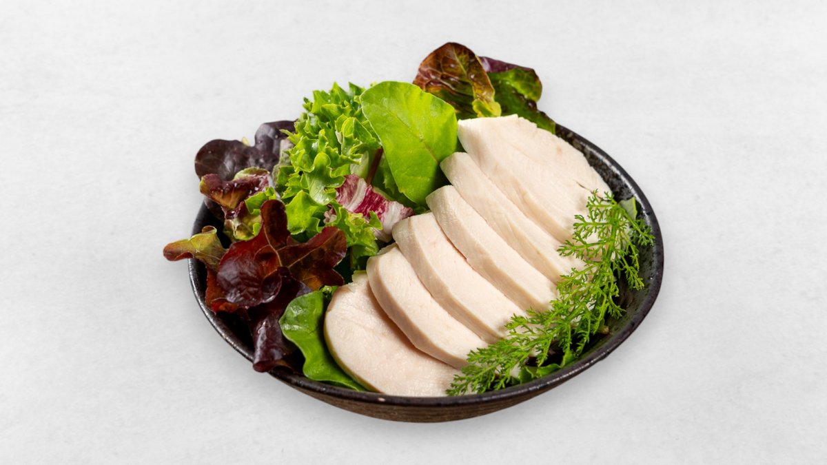 Hühnerfiletstücke auf Pflücksalat, Salat-Mix, Sesam-Dressing