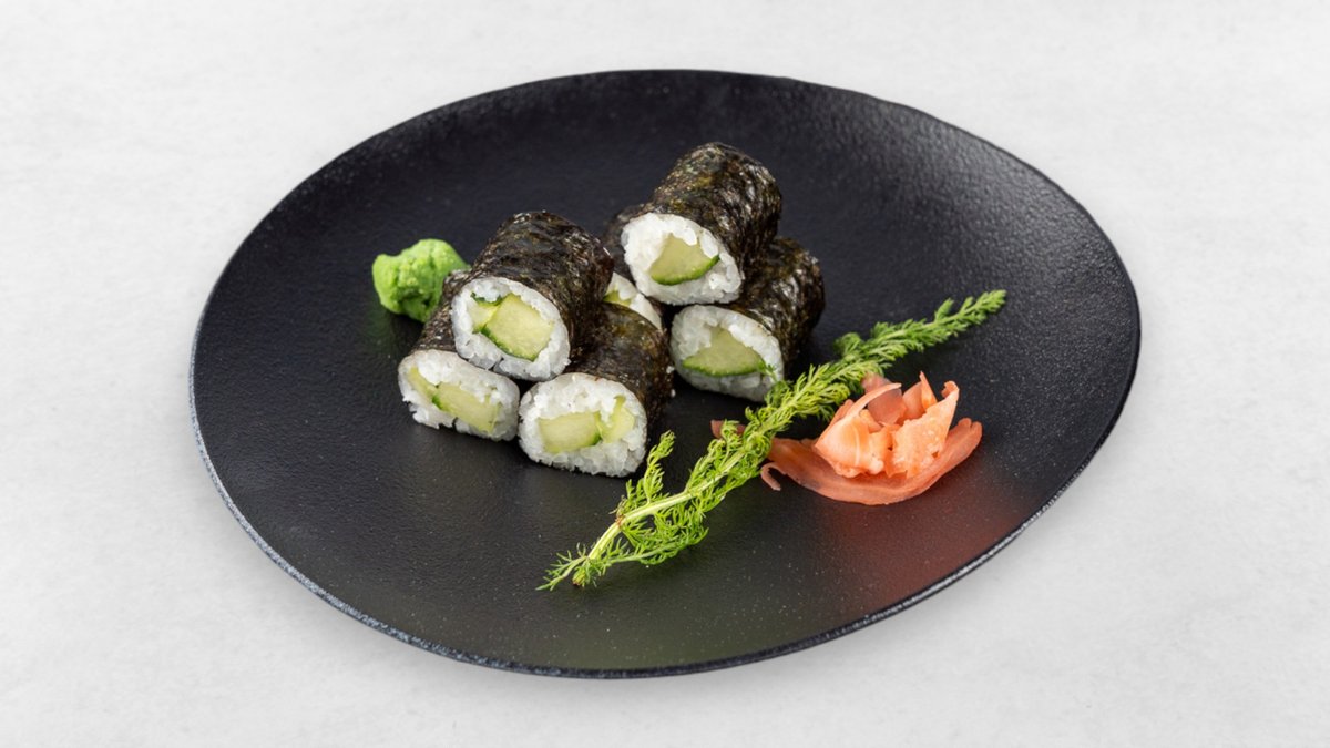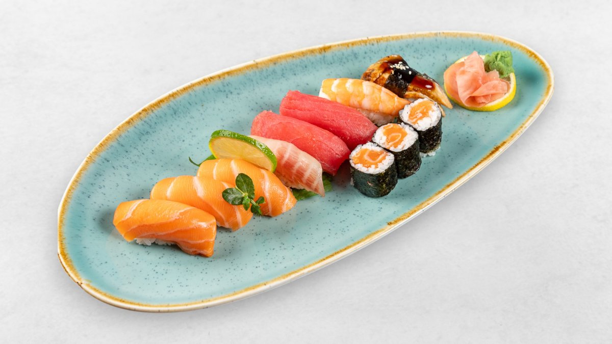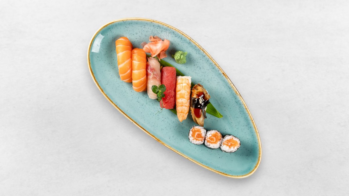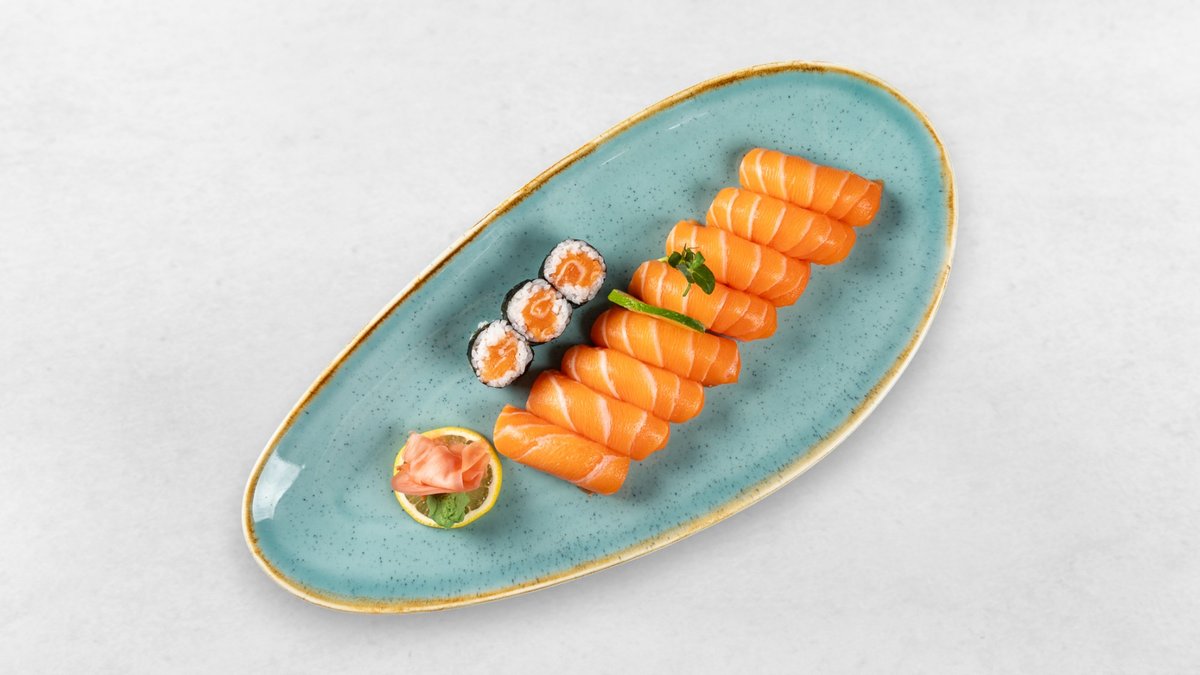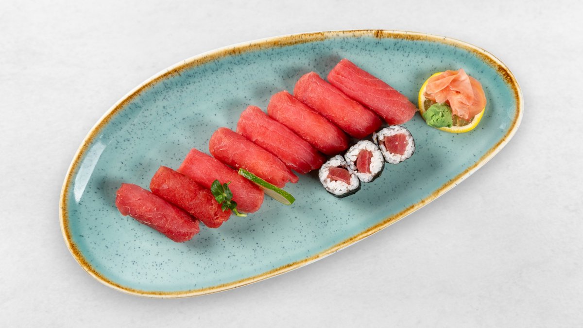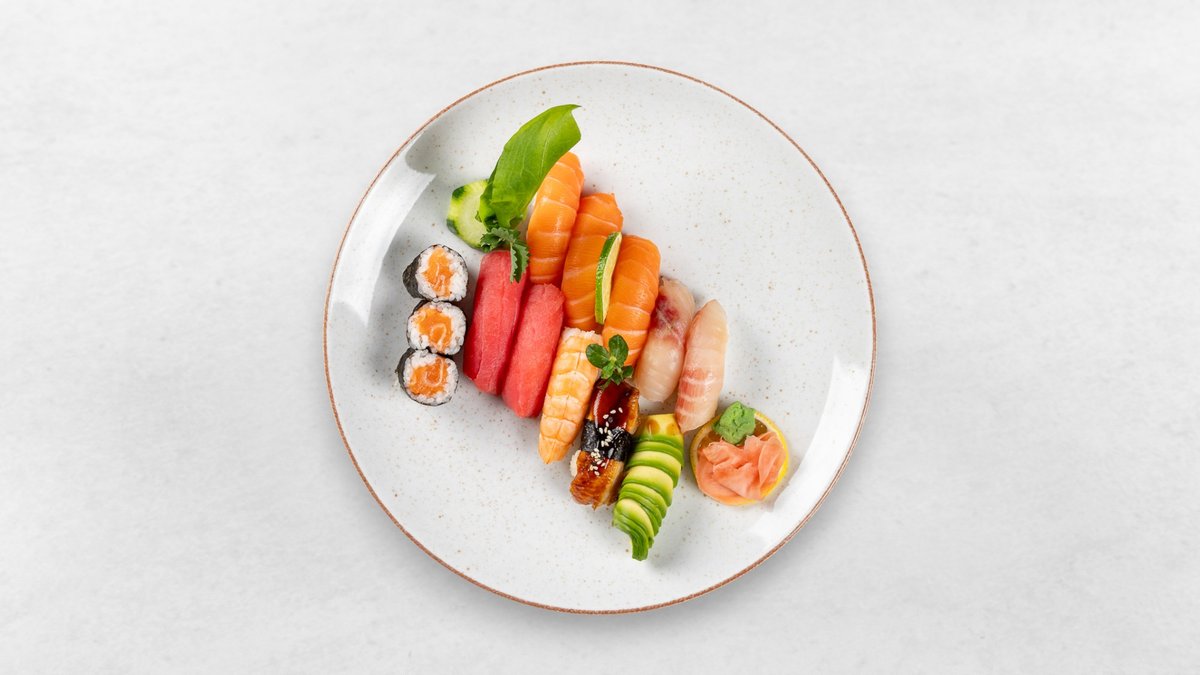 Rindfleisch-Carpaccio, Salat, Tobiko, Wasabi-Mayonnaise, Lachs, Avocado