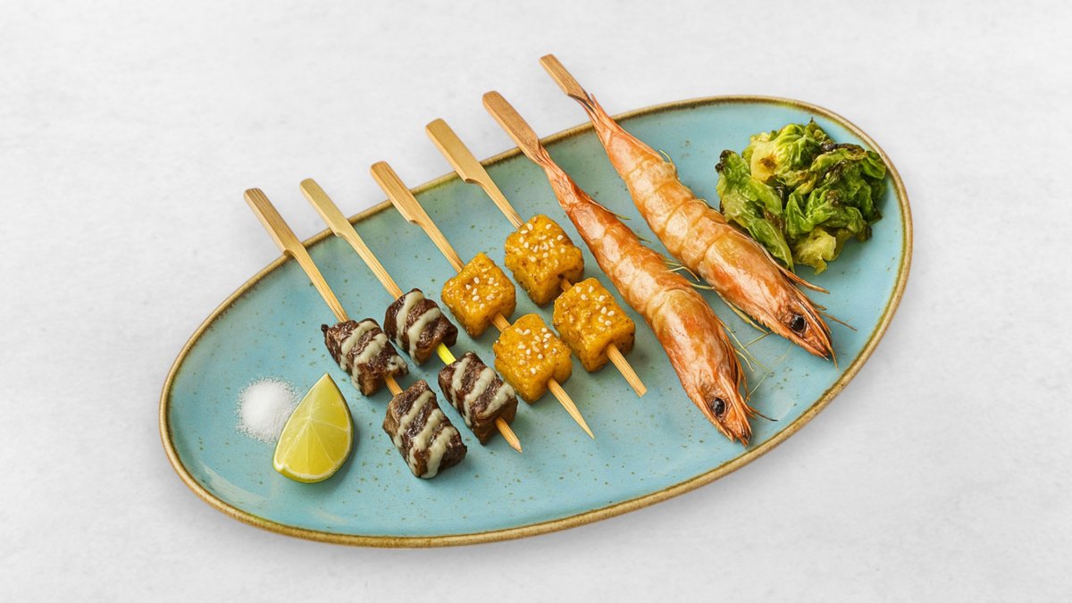 Mix aus 6 gegrillten Spießen-Satay, Hühnerfleisch, Garnelen, Wasabi, Rindfleisch