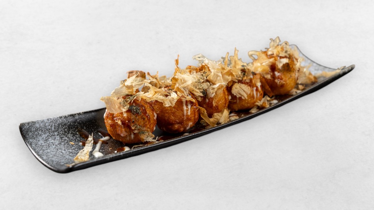 Gebackene Teigbällchen, Oktopus, Jungzwiebeln, Bonitoflocken