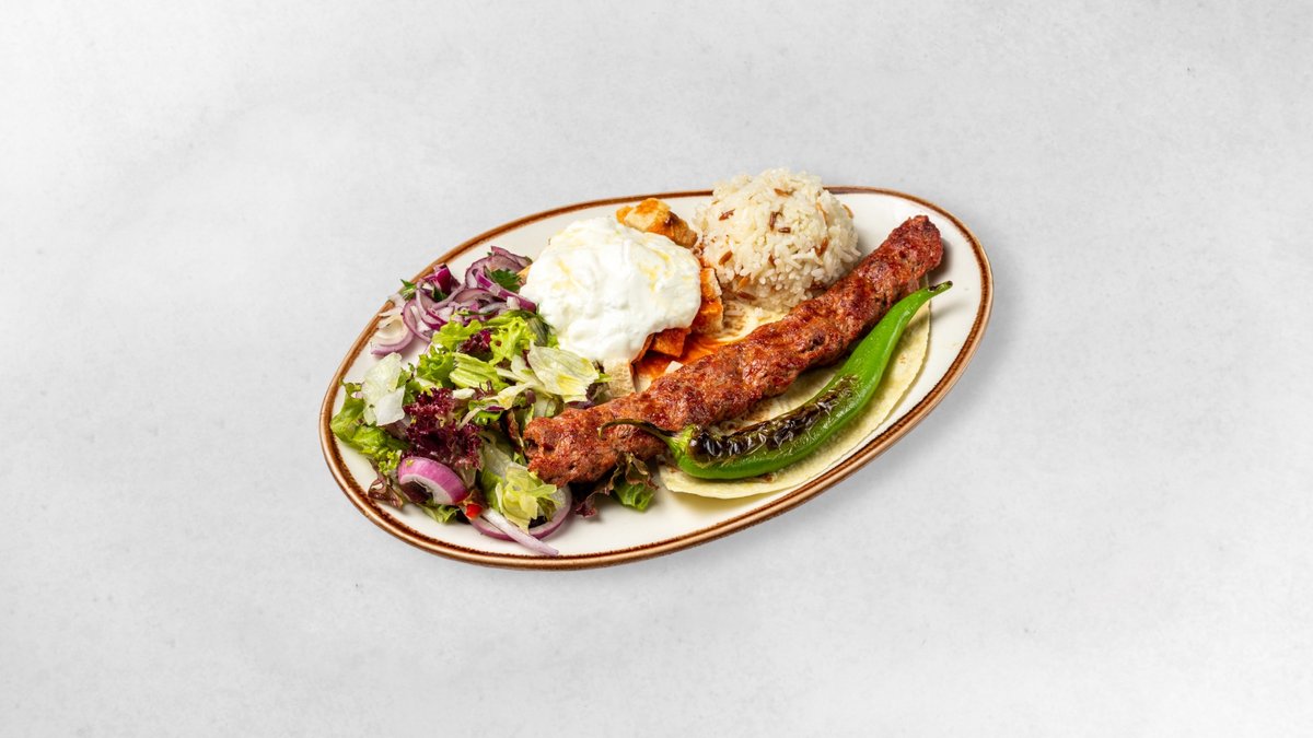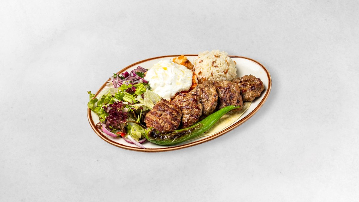 Faschiertes Kalbfleisch vom Spieß, Weißbrot, Joghurtsoße, Tomatensoße, Salat, Beilage deiner Wahl