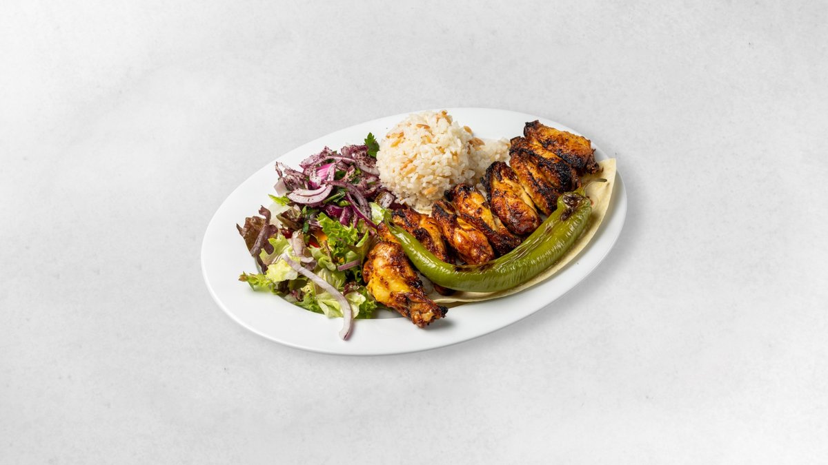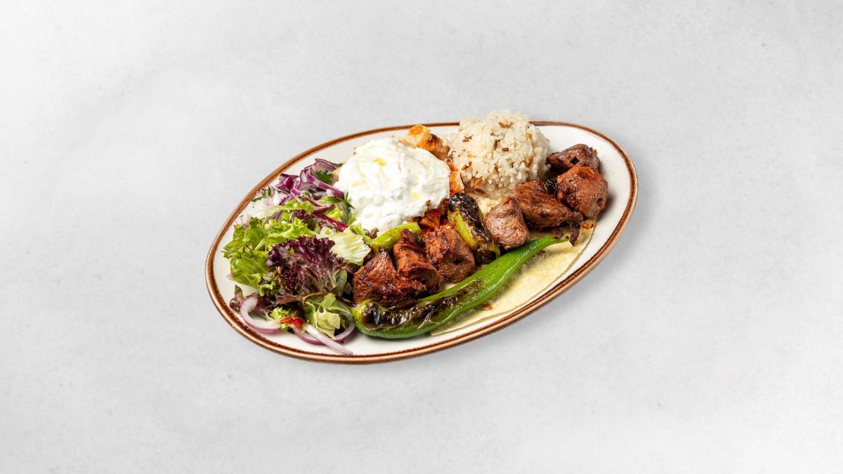 Lammspieß, Weißbrot, Joghurtsoße, Tomatensoße, Salat, Beilage deiner Wahl