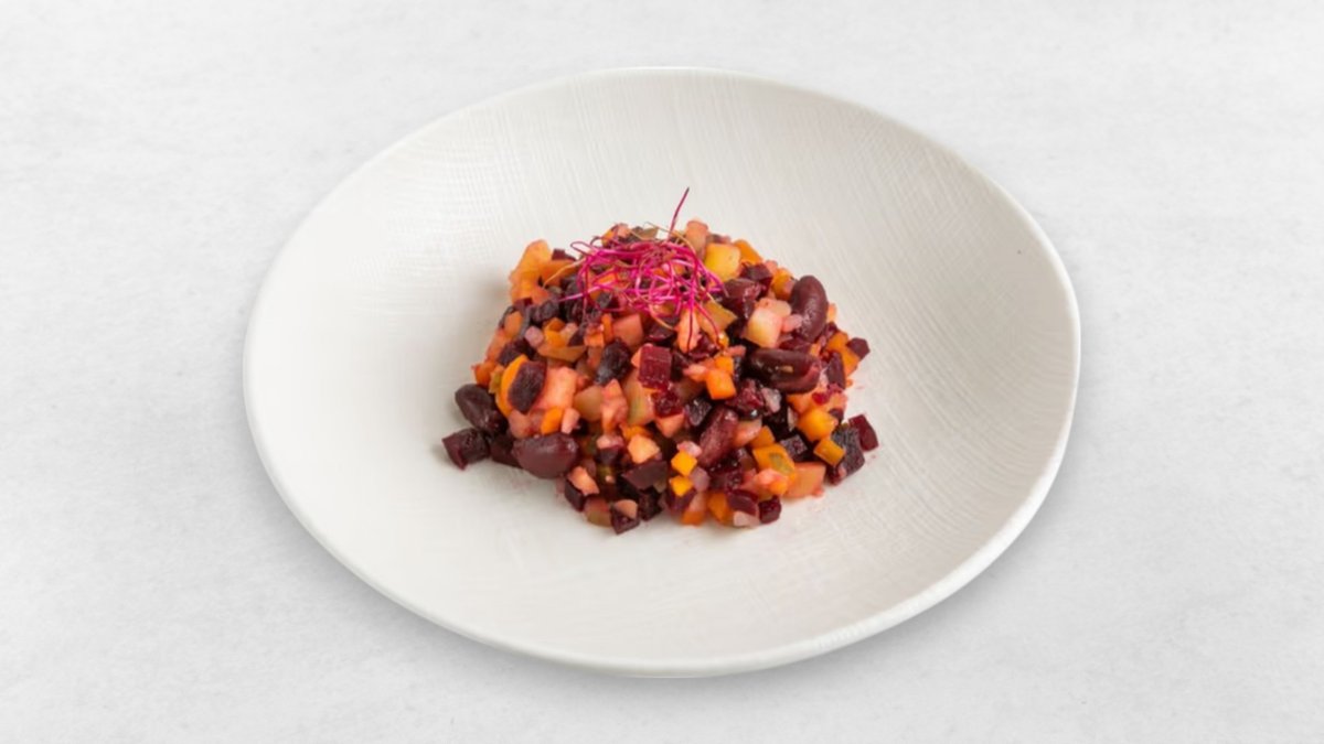 Kartoffel, Bohnen, Rote Beete, Karotten, eingelegte Gurke, Pflanzenöl
