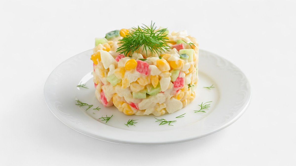 Frischer Surimi-Salat mit Mais, Ei und Eisbergsalat, serviert mit cremiger Sauce aus Mayonnaise, Sauerrahm und Senf