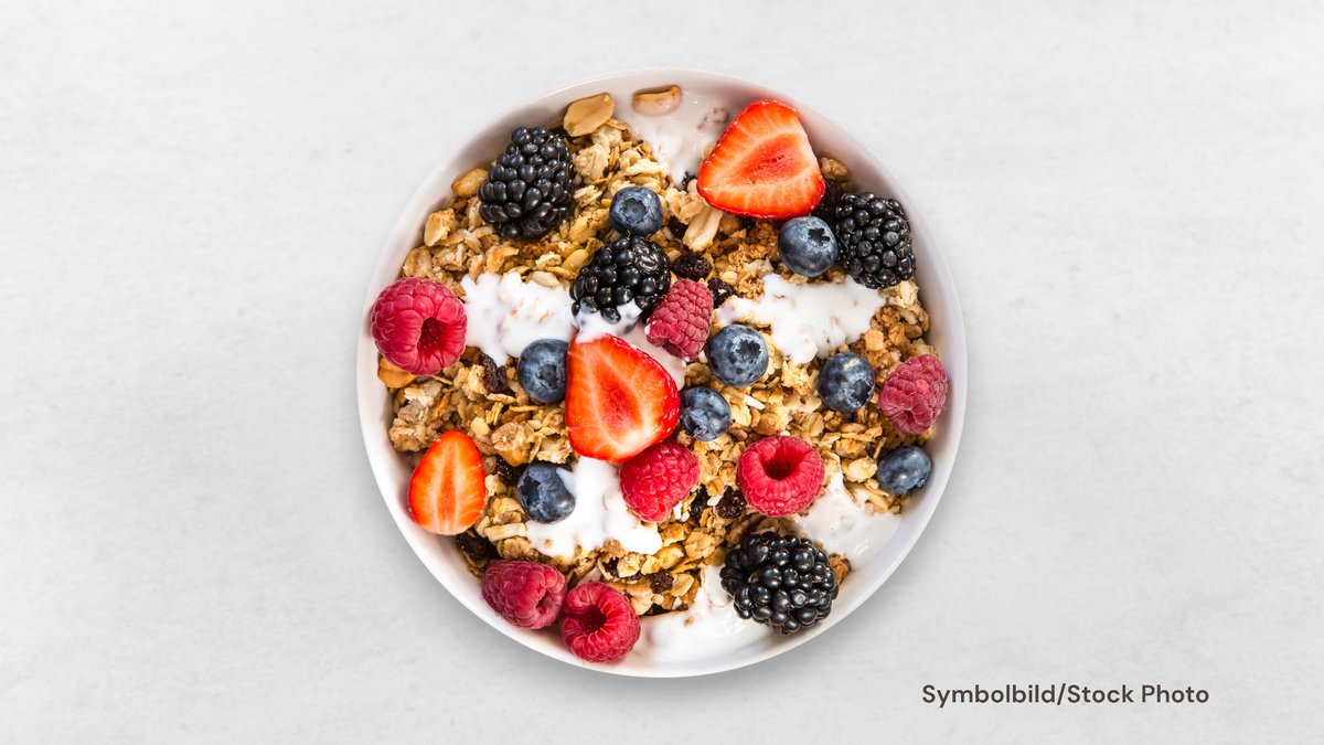 Haferflocken, Milch, Joghurt, frische Früchte, Nüsse, Honig