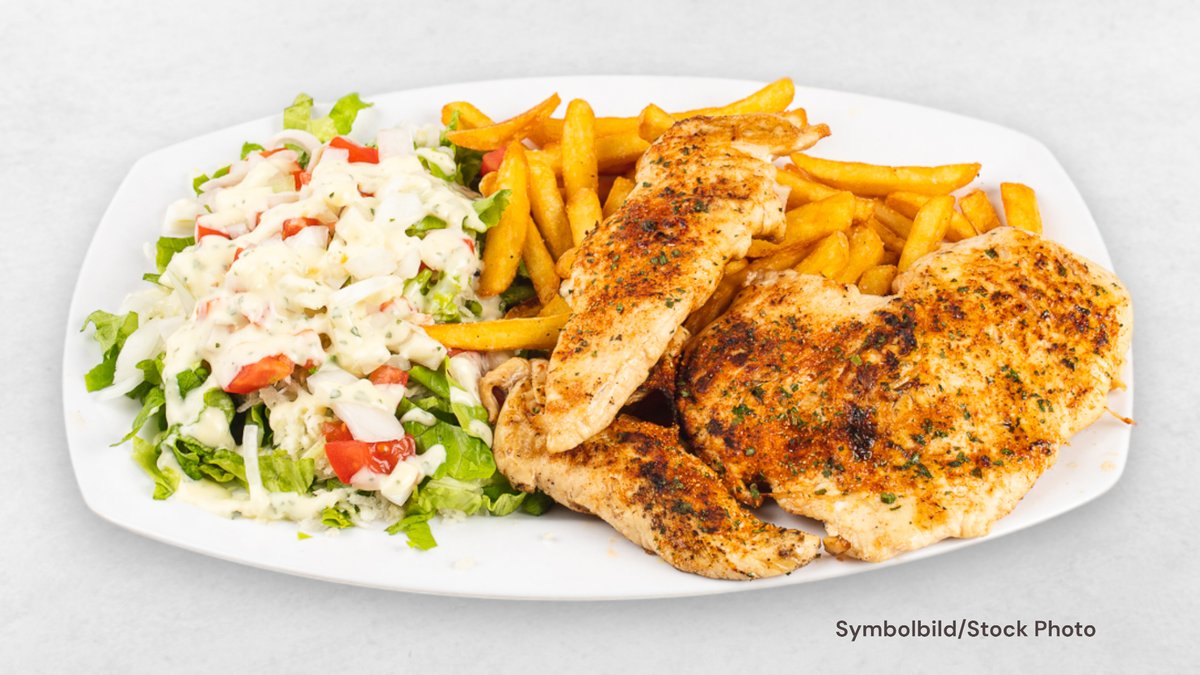 Hühnerbrust, Krautsalat, grüner Salat, Pommes frites, Soße, Tomaten