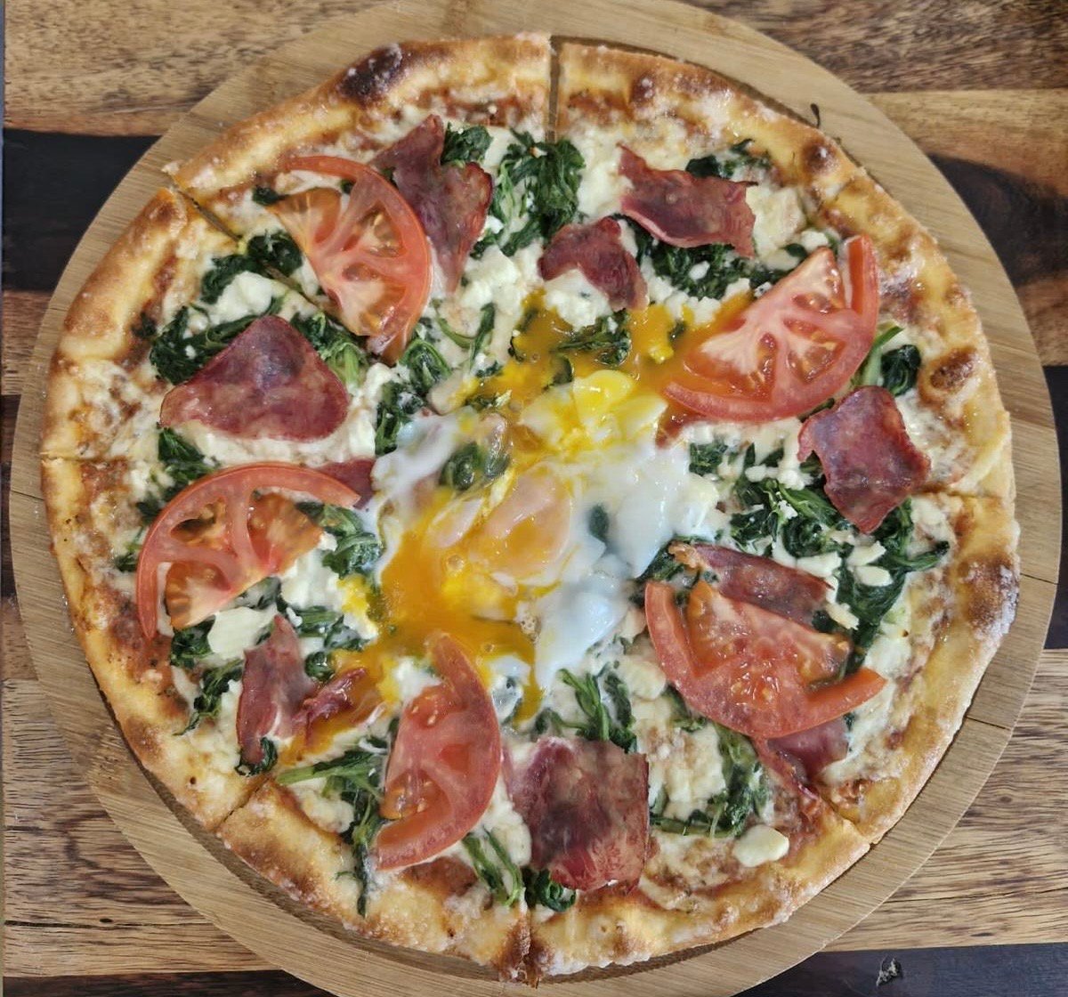 Speck, Zwiebel, Ei, milde Pfefferoni