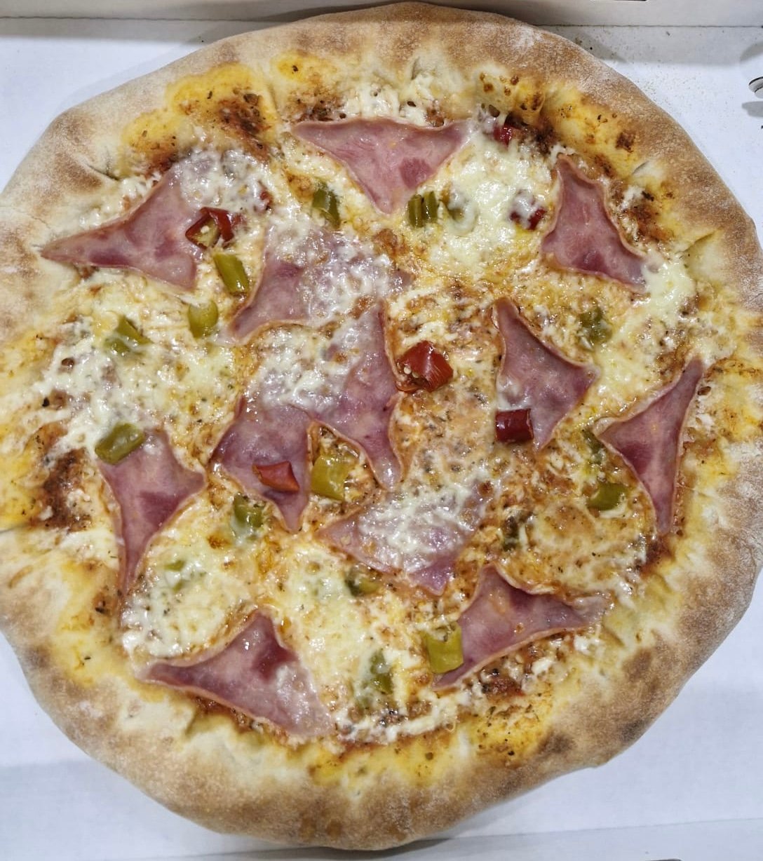 Schinken, Champignons, Speck, Pfefferoni, Ei, Mais
