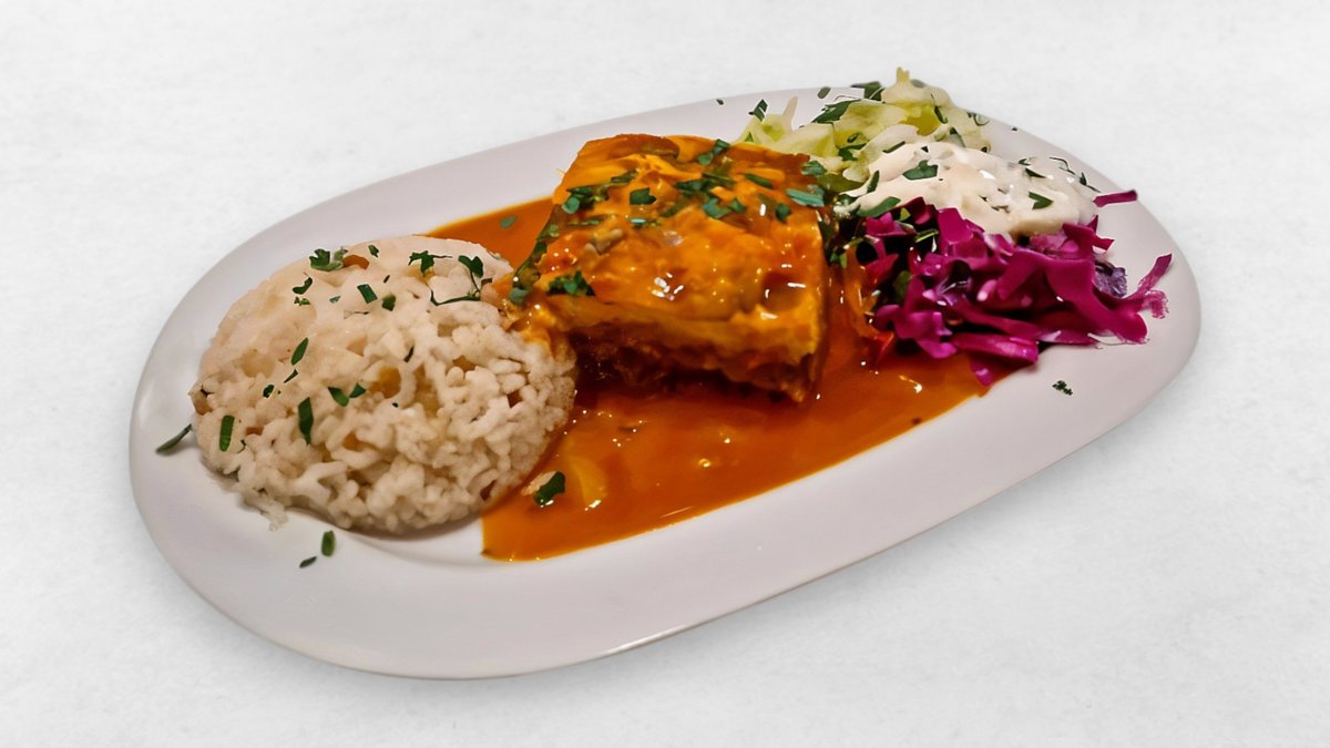 Faschiertem, Kartoffeln, Bechamelsauce,Melanzani, Olivenöl,Reis, Cacigi