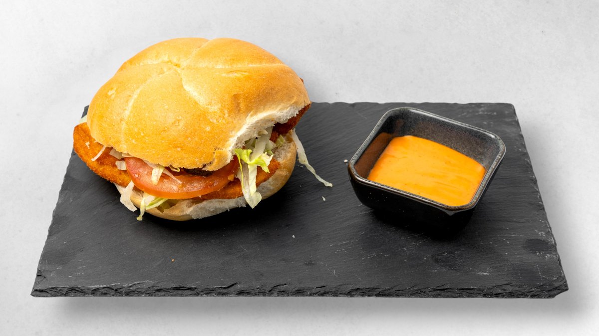Knusprig paniertes Hühnerschnitzel, frischer Salat, Tomaten, Cheddar, Cocktailsoße, Tortilla-Wrap