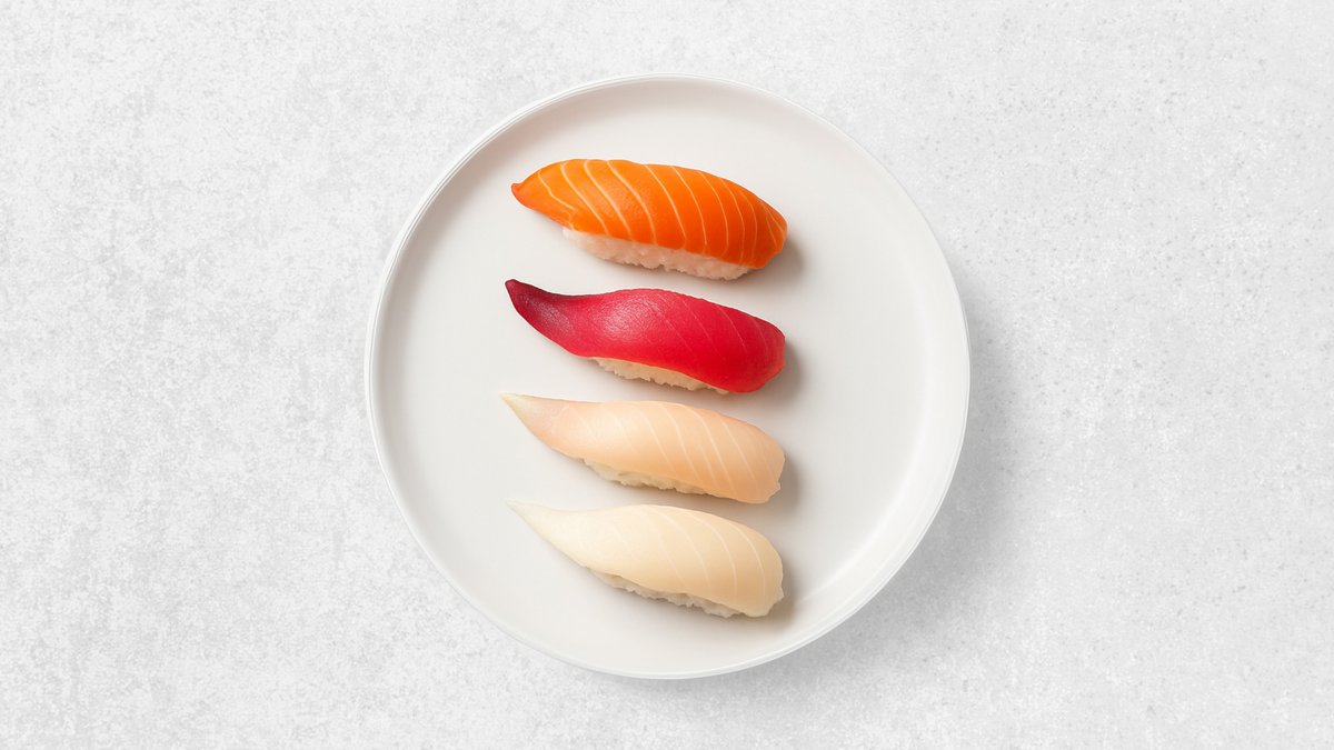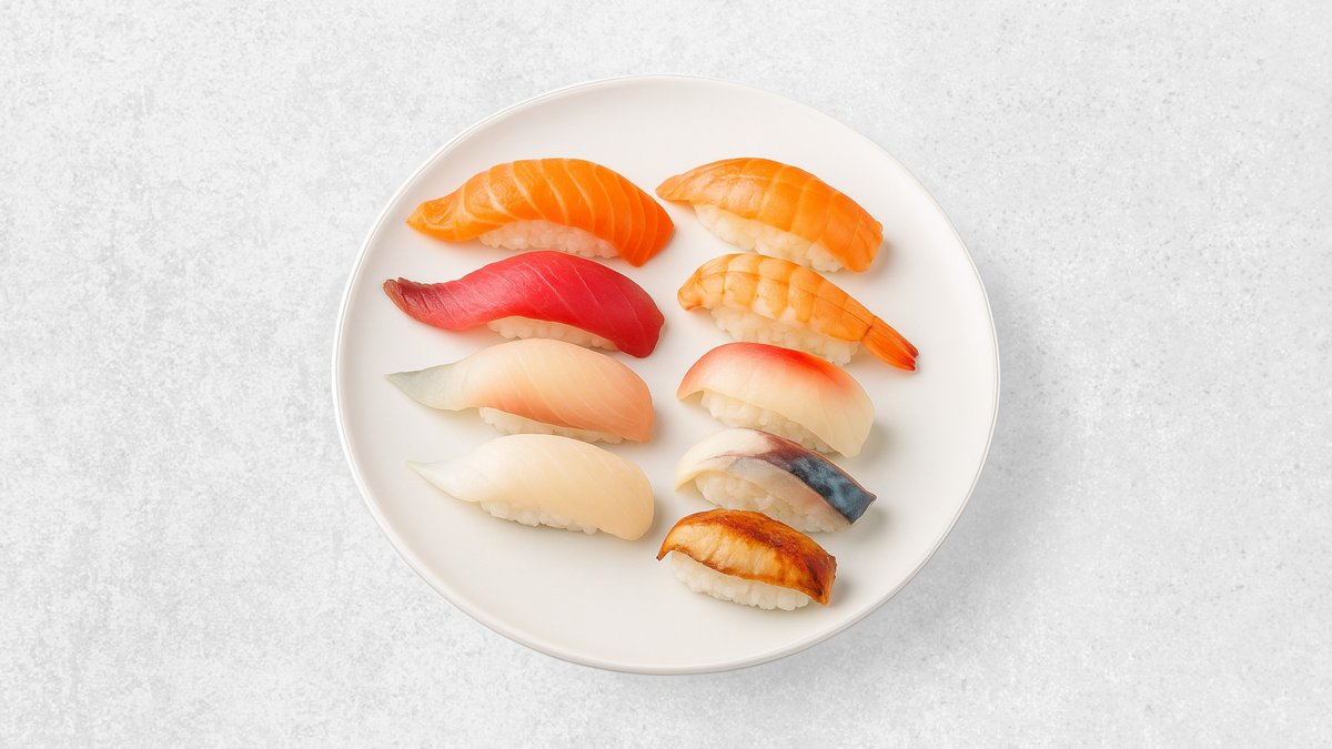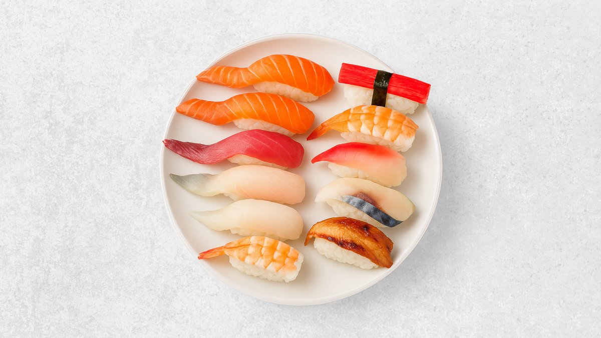 Lachs Thunfisch, Garnelen, Surimi, Hamachi, weißer Heibutt, Goldbrasse, Wolfsbarsch, Aal, Hokikai, Amaebi, Jakobmuscheln
