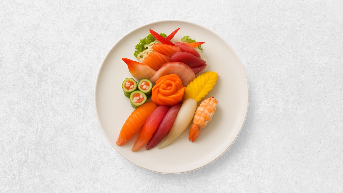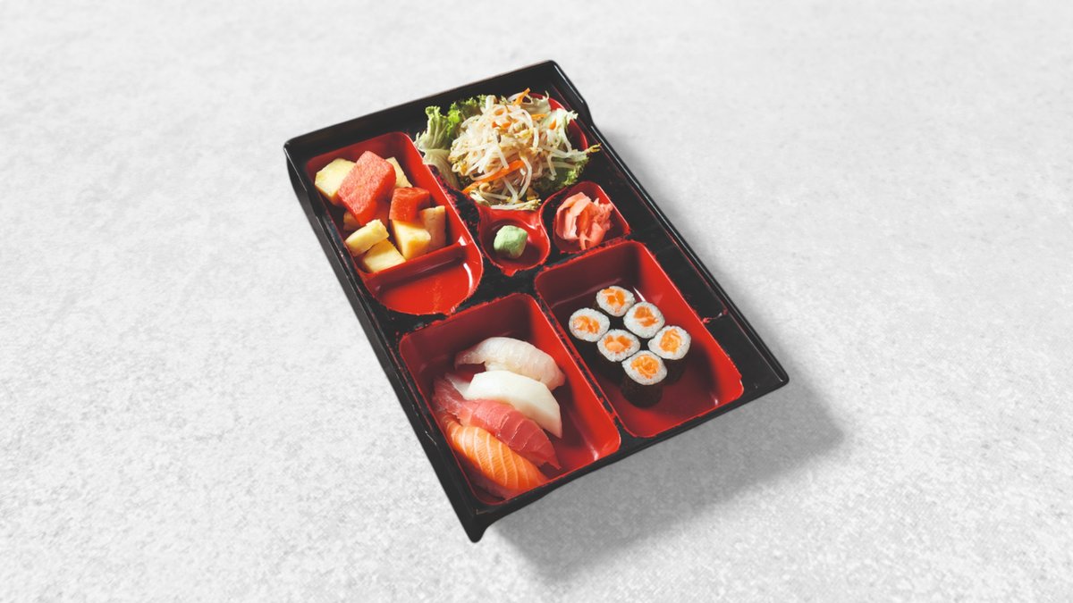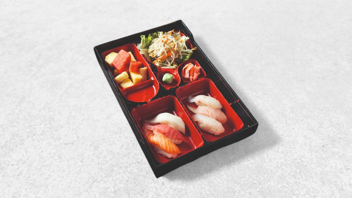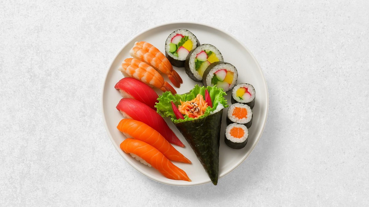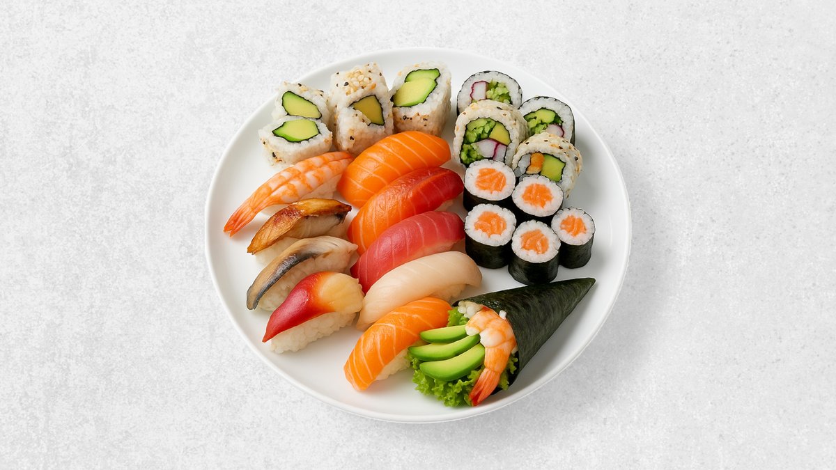 Für 2 Personen Lachs, Thunfisch, Garnelen, Surimi, Hamachi, weißer Heibutt, Goldbrasse, Wolfsbarsch, Aal, Hokikai, Amaebi, Jakobmuscheln